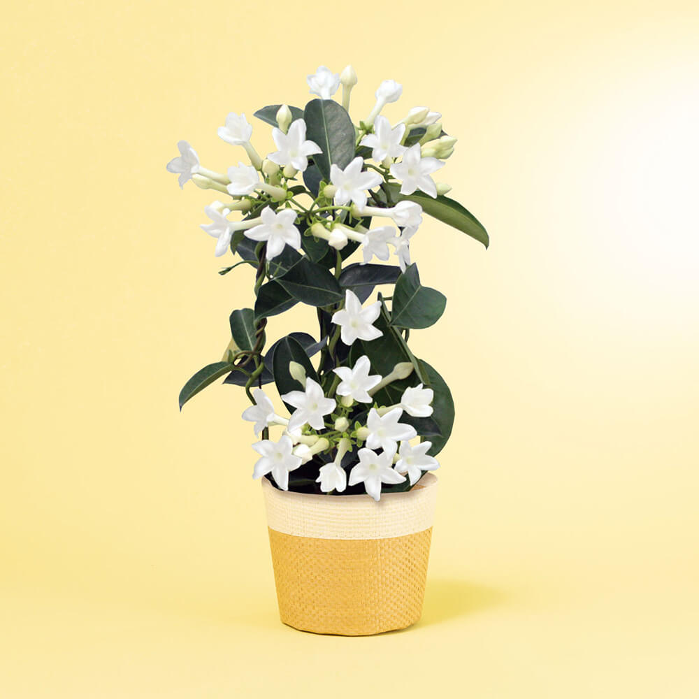 光沢のある深い緑の葉に、純白の星形の花が映えるマダガスカルジャスミン。 その気品あふれる佇まいから、花言葉は「清純」「幸福な愛」。ウェディングブーケの花材としても愛される、縁起の良いお花です。大切な方へ「幸福」を届けるギフトとして、またご自宅で優雅なリラックスタイムを過ごすためのパートナーとして、最高の一鉢をお届けします。