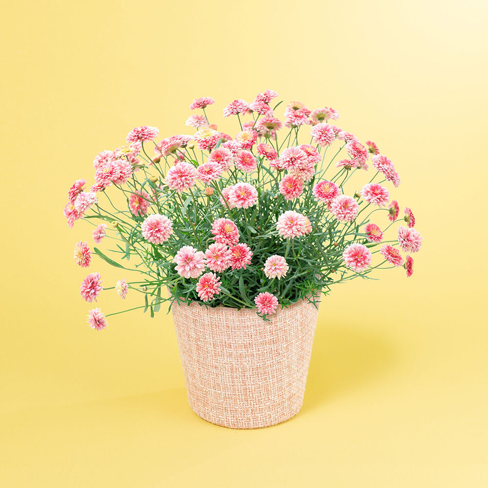 小さな花びらがぎゅっと集まった、可愛らしい「ポンポン咲き」のマーガレットはいかがですか?咲き進むにつれて中心がふっくらと盛り上がり、まるで舞妓さんが身につける繊細なかんざしのような雅やかな表情を見せてくれます。