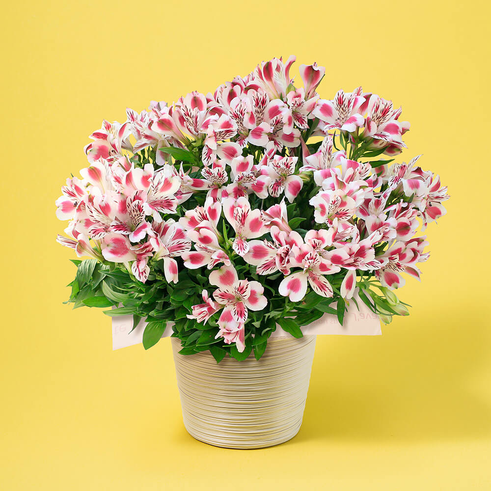 「持続」「未来への憧れ」という前向きな花言葉を持ち、一輪咲くだけで周囲をパッと明るい希望で満たしてくれるような存在感があるアルストロメリアを鉢植えでお届けします。花びらの中央にさす鮮やかな色彩と、それを引き立てる柔らかなグラデーションのコントラストは、まさに自然が描いたアート。大切な方へ「長く続く幸せ」を願って贈る、母の日の特別なギフトです。
