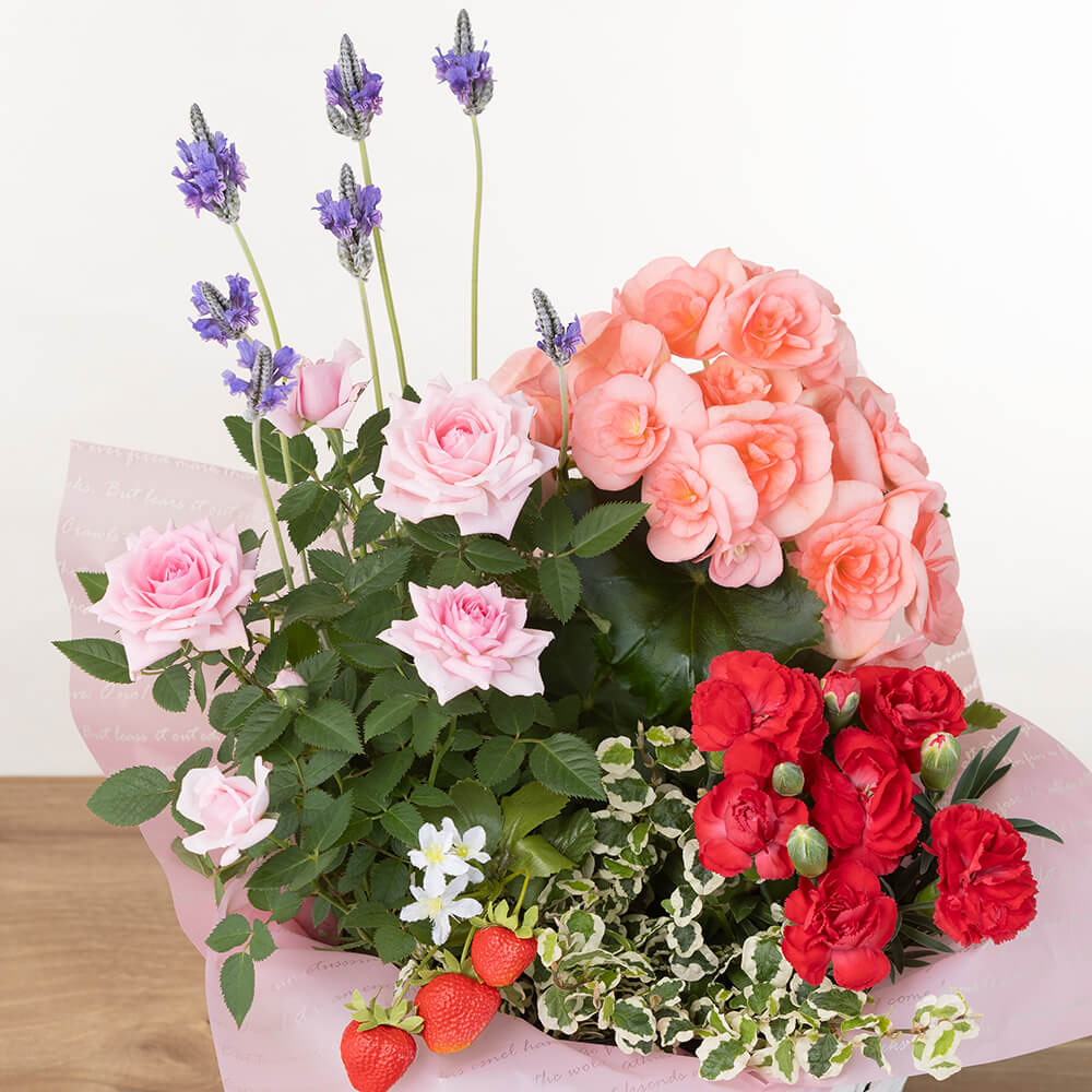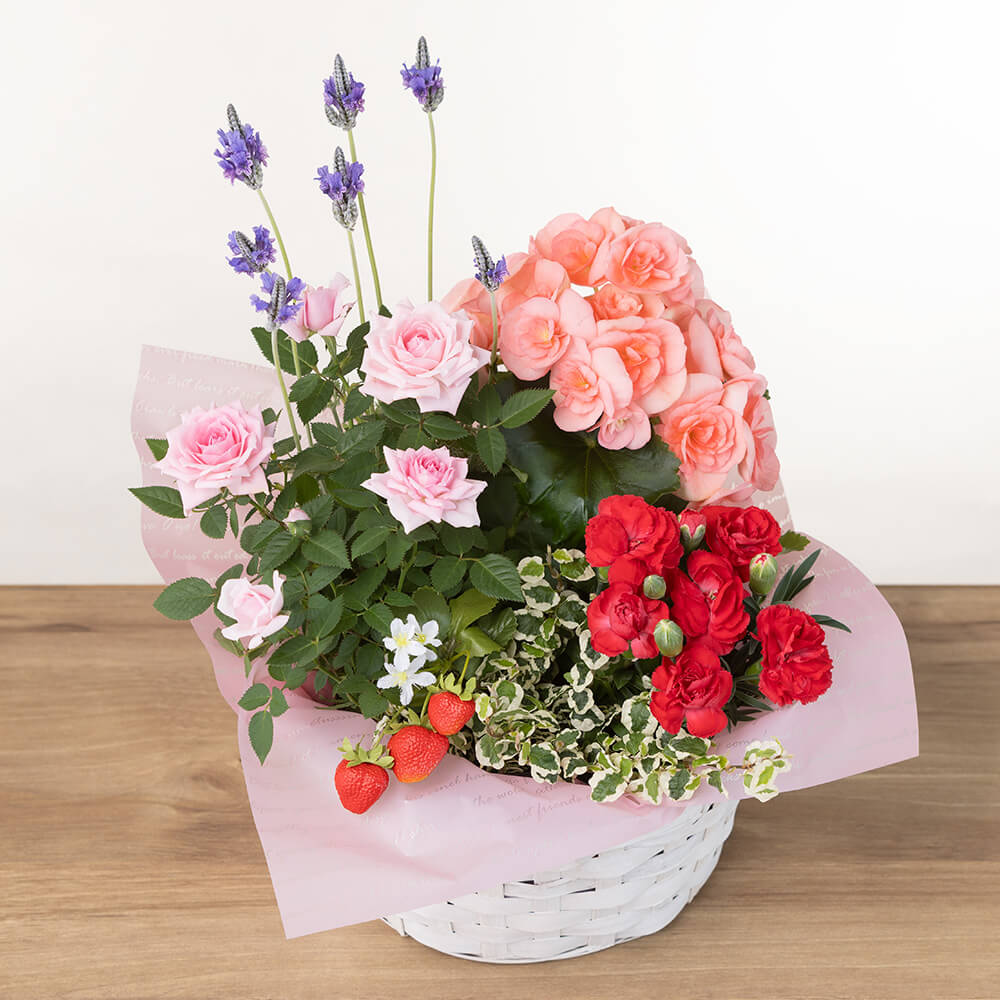 母の日の定番カーネーション、香りのよいラベンダー、人気のミニバラやベゴニアを合わせた寄せ鉢バスケット。母の日らしい赤とピンクの花々にラベンダーの紫を差し色にし、大人可愛いバスケットに仕上げました。同時にたくさんのお花を楽しめるので、まるでお花畑を切り取ったような満足感があります。それぞれが小さなポットに入っているので、しばらくはバスケットのままお部屋で楽しんでいただき、その後はお庭でそれぞれの植物に適した管理をしてあげるとお花が長持ちします!
