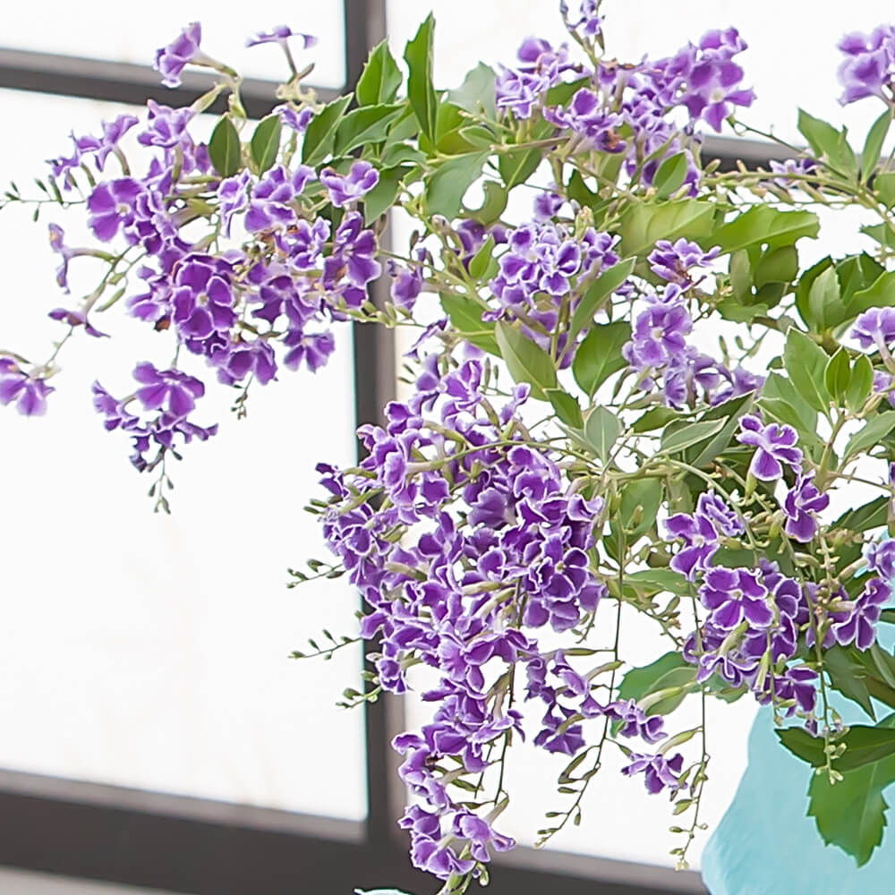 初夏を代表する香りの花ガーデニア(くちなし)をメインに、女性的で繊細な印象の山アジサイ「伊予獅子てまり」、紫色のデュランタ、ナデシコを合わせた『和モダン』をテーマにした初夏の風情あふれる寄せ鉢です。ガーデニア(くちなし)を入れているので、お部屋のなかで甘く優しい香りをお楽しみいただけます。