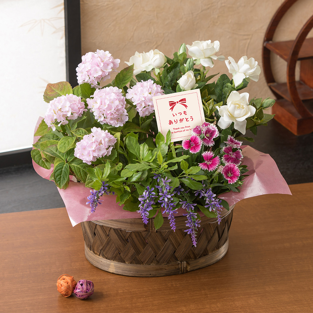 | 花材 | ガーデニア(くちなし)、アジサイ(伊予獅子てまり)、デュランタ、ナデシコ ※ガーデニアは植物の性質上つぼみの状態でのお届けになります。 ※ポットに入った植物をバスケットに詰め合せた商品です。 |