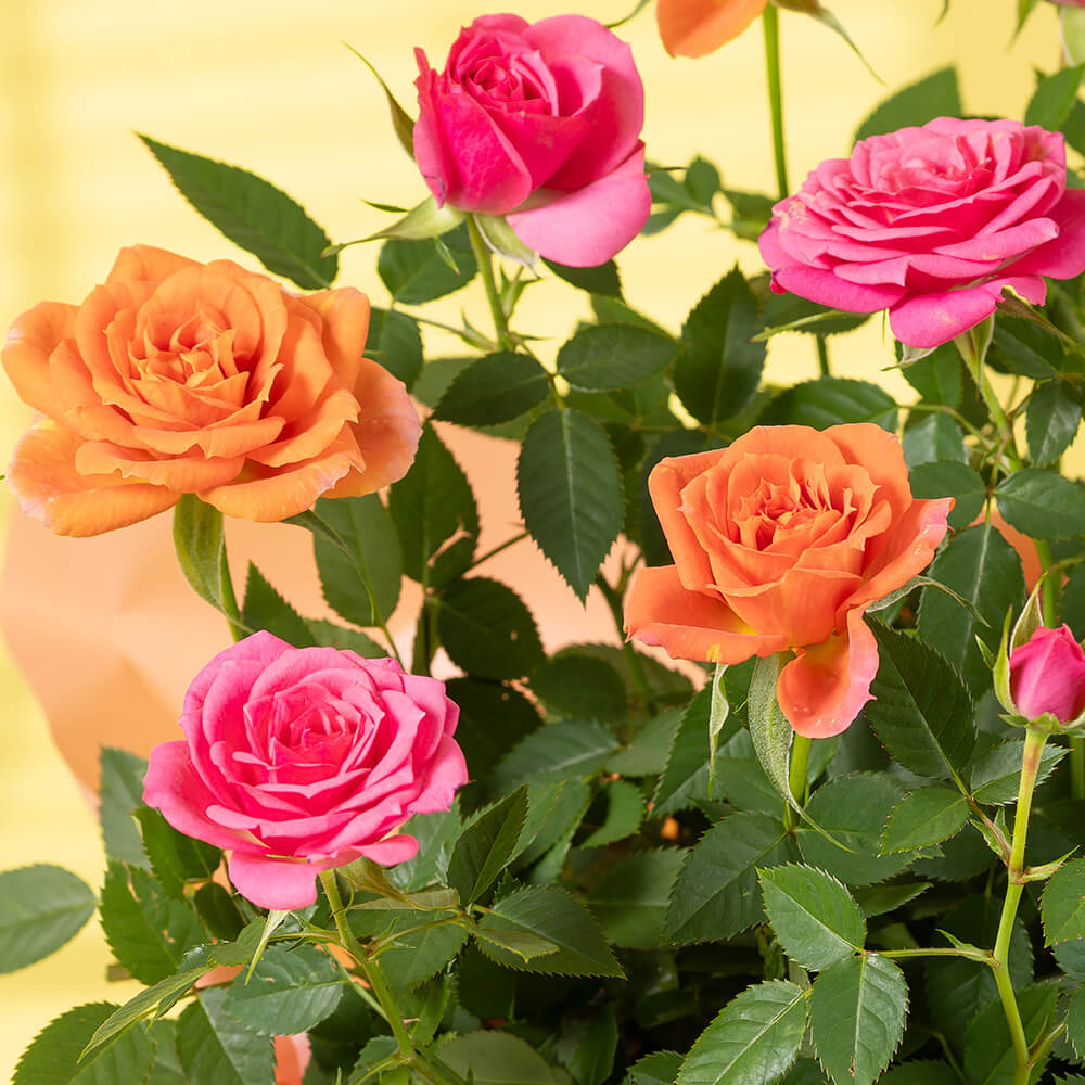 ビタミンカラーのオレンジと、濃淡の美しいピンクをバランスよく配置した鮮やかなコントラストを楽しむミニバラ寄せ植えです。一鉢で圧倒的な彩りを楽しめます。お手入れのポイント
