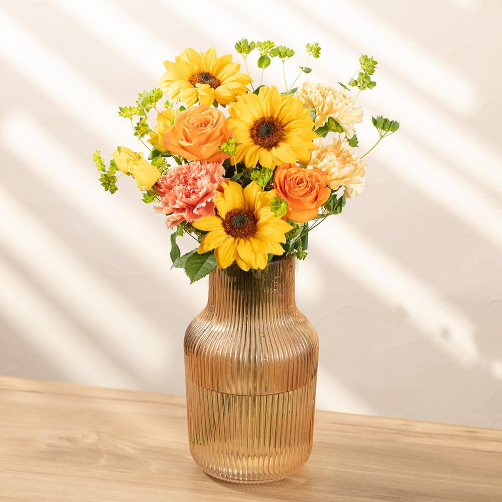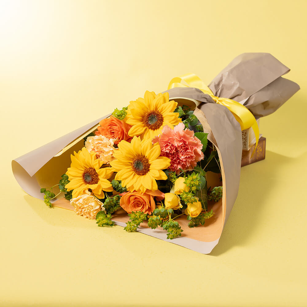 太陽の花「ヒマワリ」をメインに元気いっぱいのビタミンカラーの花々を合わせた花束です。優しさと温かさがあるお日様色の花々は、見ているだけで、お母さんもほっこり笑顔になります。