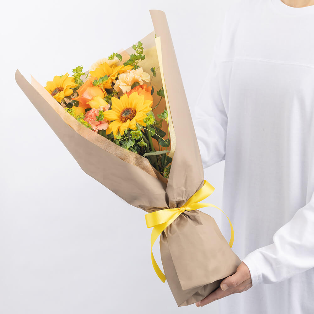 お花は元気な印象ながら、ブラウン系のラッピングでナチュラルな落ち着きを添えています。