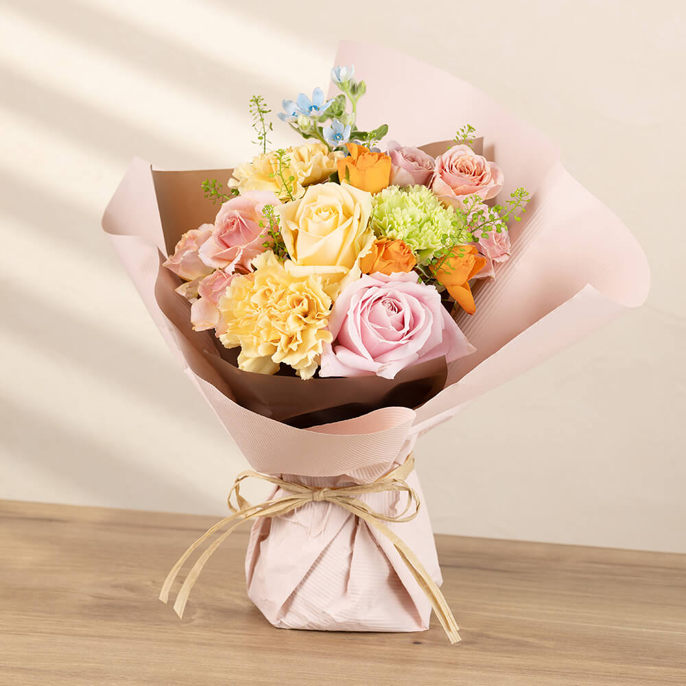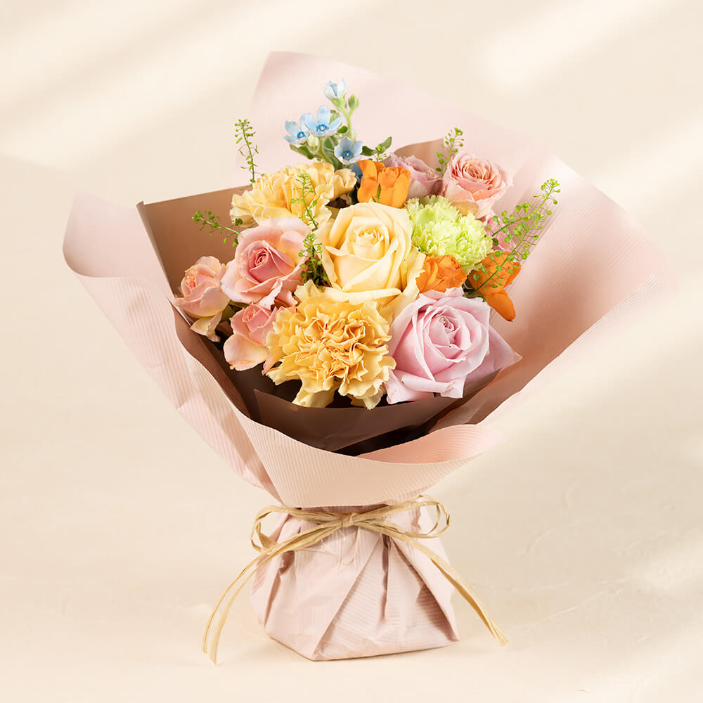 陽射しの降り注ぐ庭から摘んできたような優しい色合いの花々を贅沢に合わせた温かみのあるステンディングブーケです。可愛らしく咲き誇る淡いピンクとアプリコット色のバラにカーネーション、ブルースター、タラスピを添え、華やかさの中にもナチュラルな雰囲気に仕上げました。