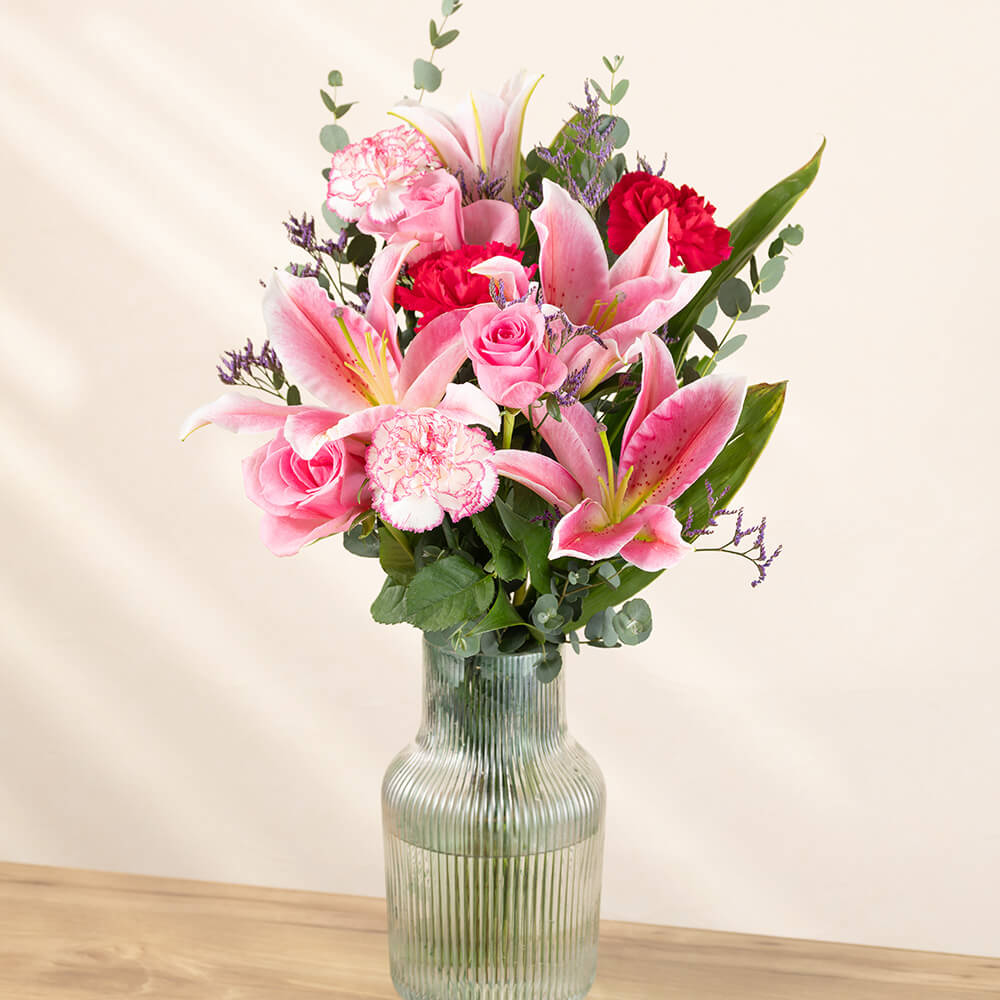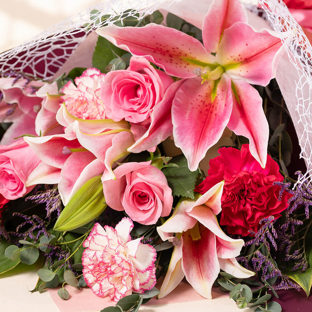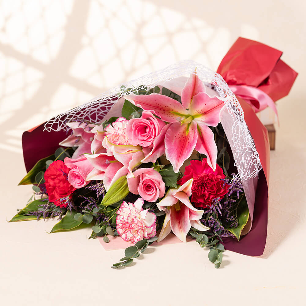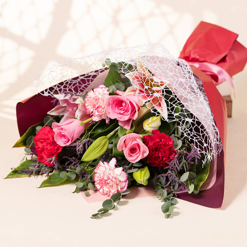 オリエンタル百合やバラ、カーネーションといった贈り物には欠かせない花を母の日らしいピンクのグラデーションでまとめ、ハイブリットスターチースが優しく包んでいます。上品なピンクのラッピングが、特別な日を祝福しているようです。