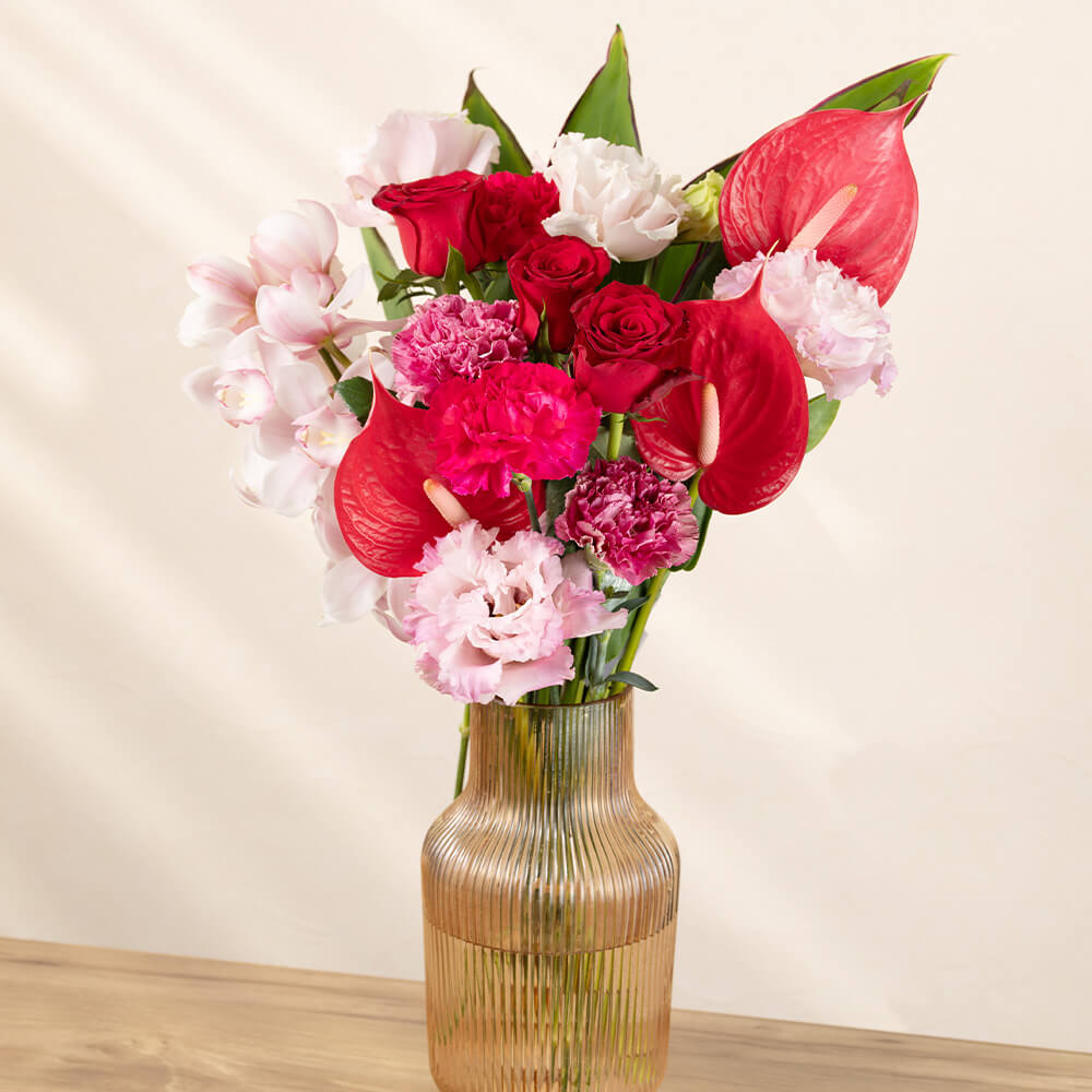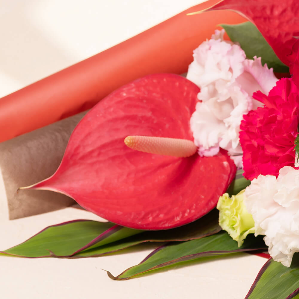 高級感のあるシンビジウム、つやのある花姿が美しいアンスリウム、あでやかに咲き誇る赤いバラなど華麗な花々を贅沢に束ねた花束です。それぞれの花の魅力を活かし、色合いのバランスを大切にしながら丁寧に束ねました。