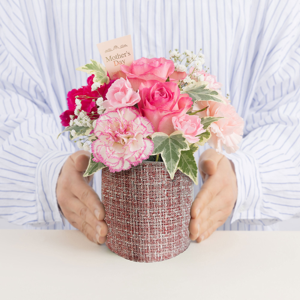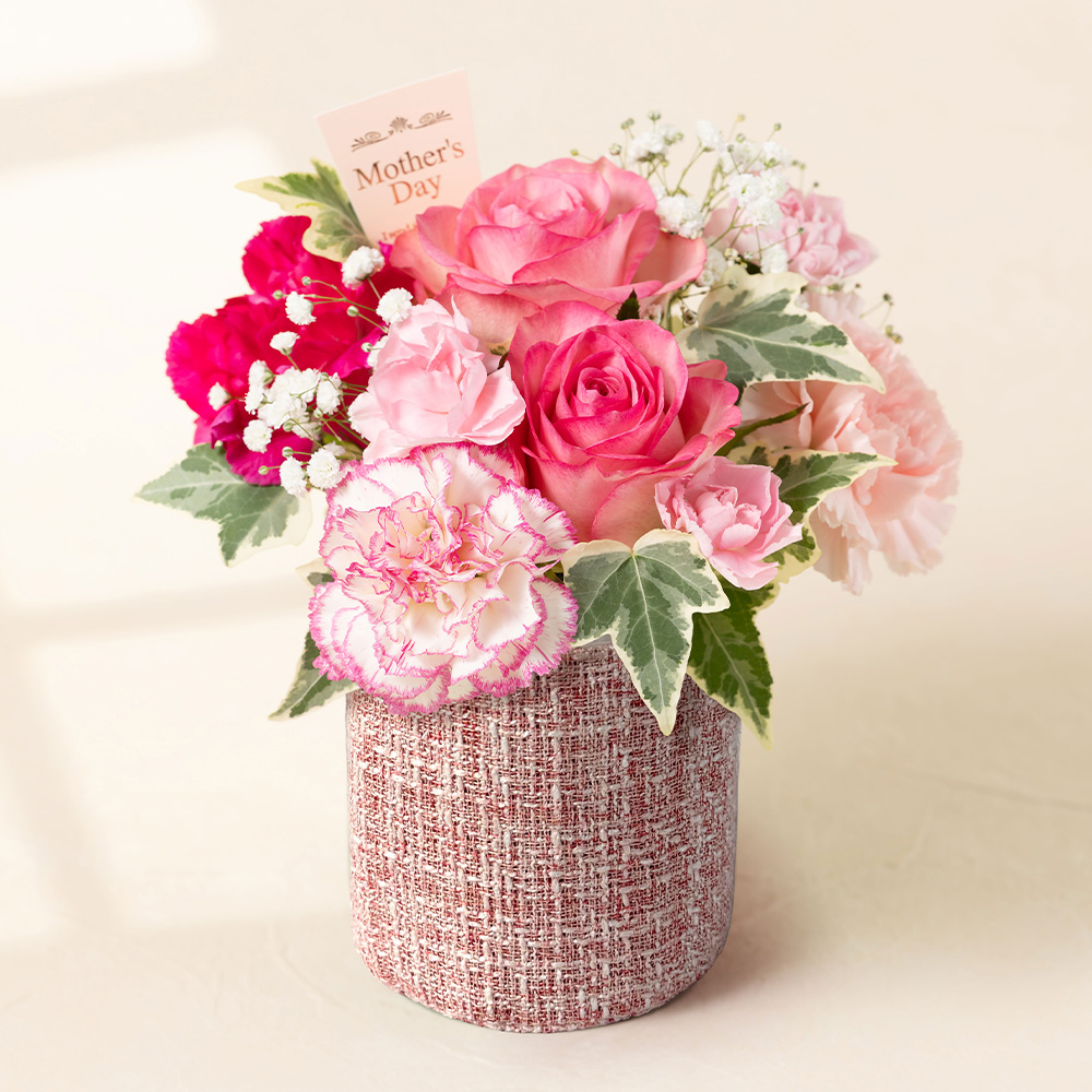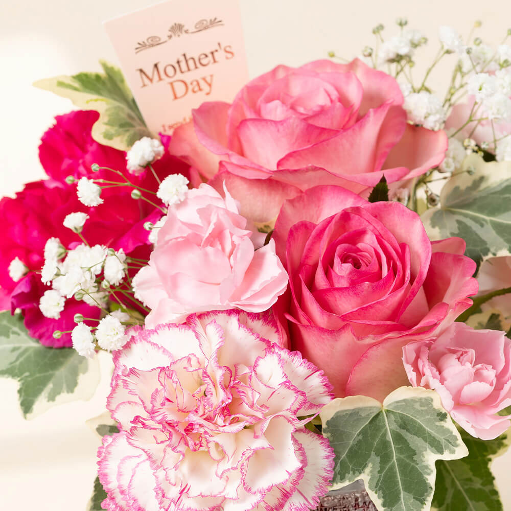 女性に人気があるピンクのバラにカーネーションを合わせたアレンジメントです。華麗に咲くバラと母の日王道のカーネーションを組み合わせ、「お母さん、いつもありがとう」の気持ちをストレートに伝えられるアレンジメントです。