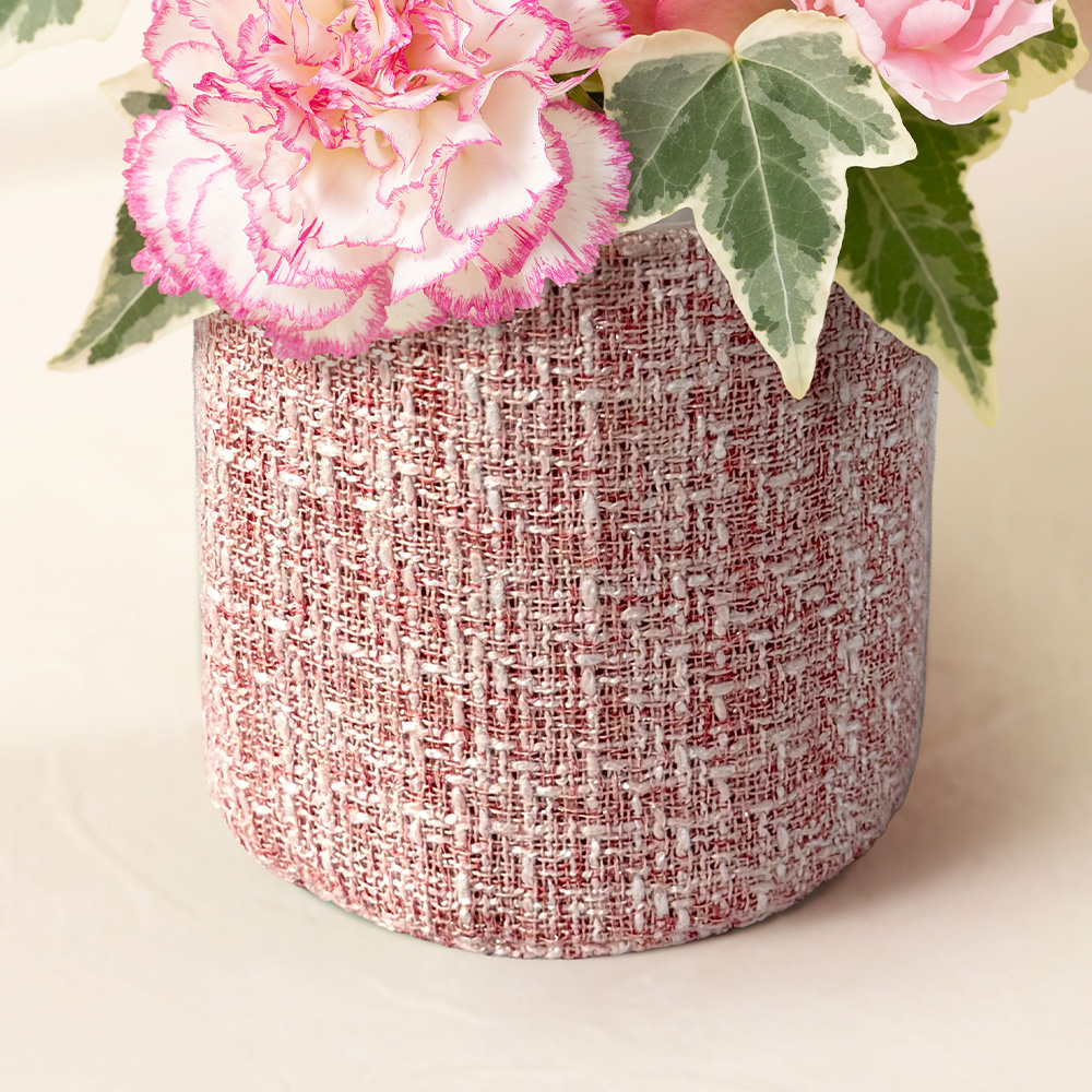 可愛らしいツイードバスケットは、ピンクの花々の相性抜群です。