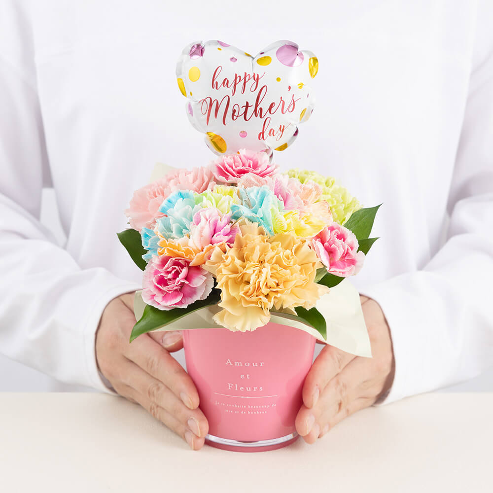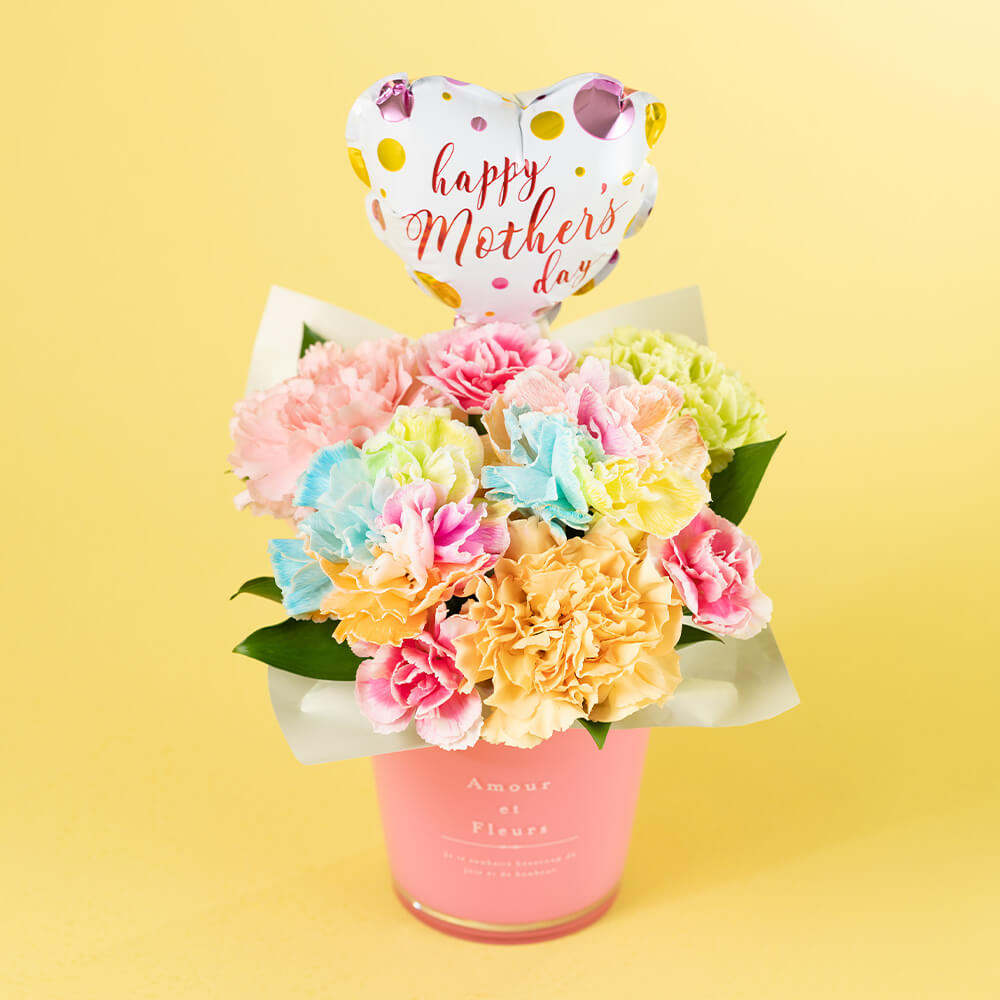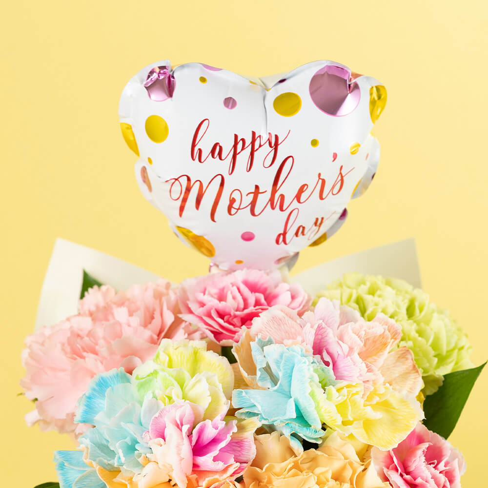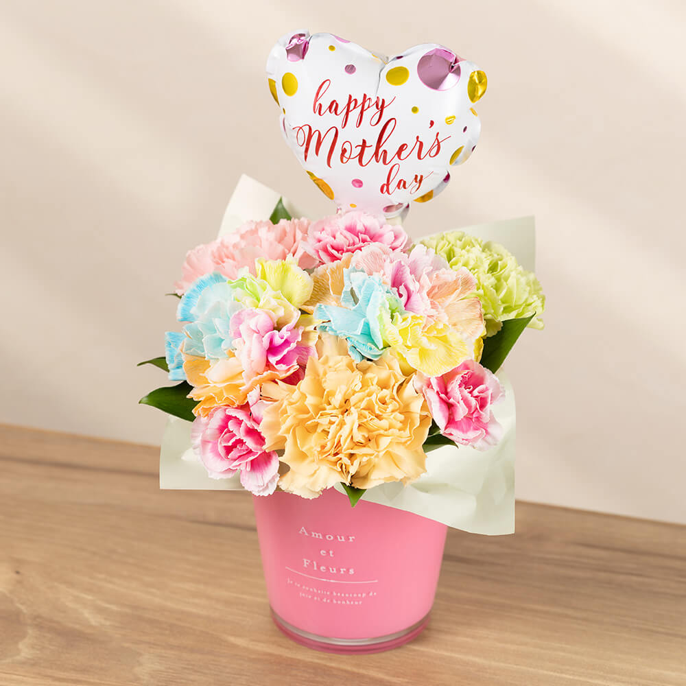 「happy mother's day」のメッセージ付きハート型バルーンを添え、母の日のお祝い気分を華やかに演出しています。