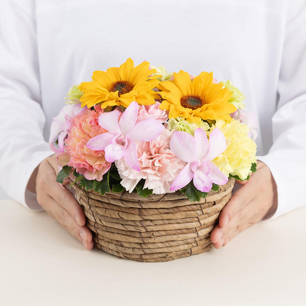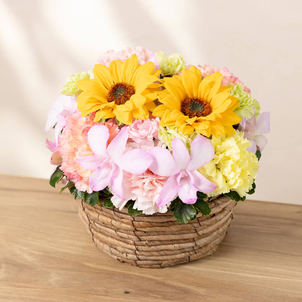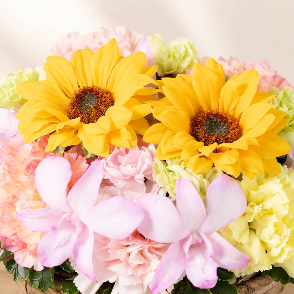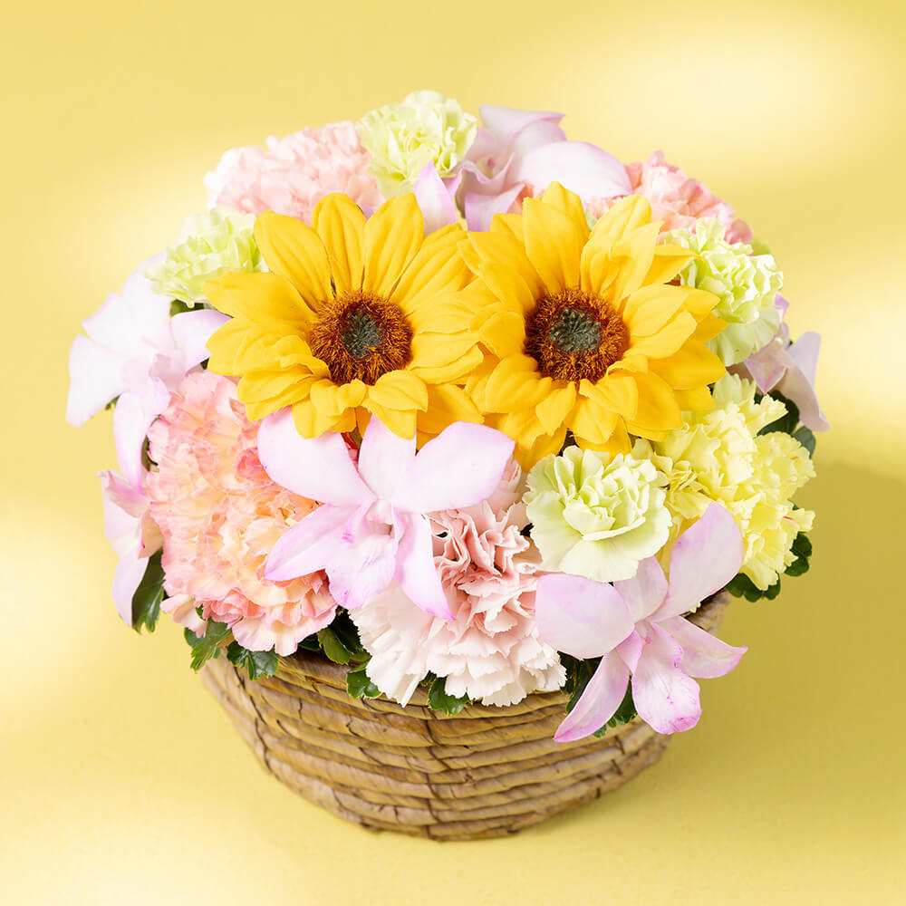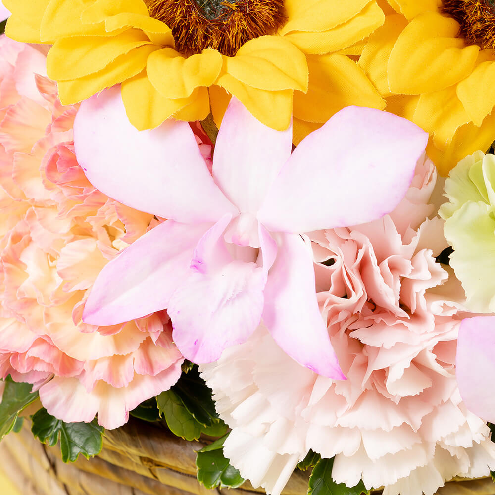 いつも元気なお母さんに贈りたいヒマワリの花は、見ているだけで明るい気分になります。ヒマワリに加えて、トレンドフラワーでもある染めのデンファレと母の日に欠かせないカーネーションを合わせ、イエローやオレンジ、ピンクのグラデーションで華やかに仕上げました。