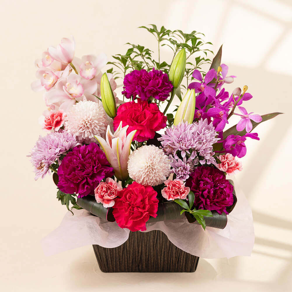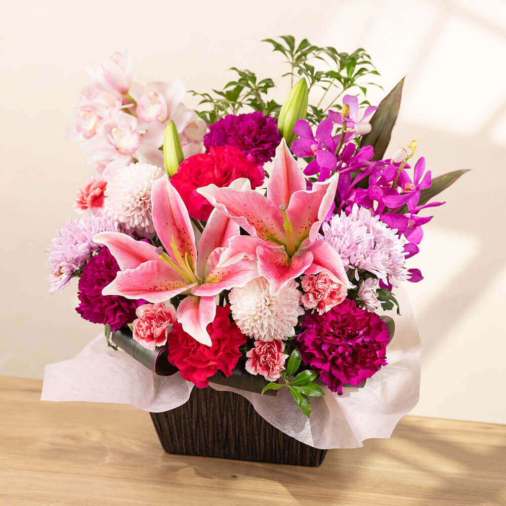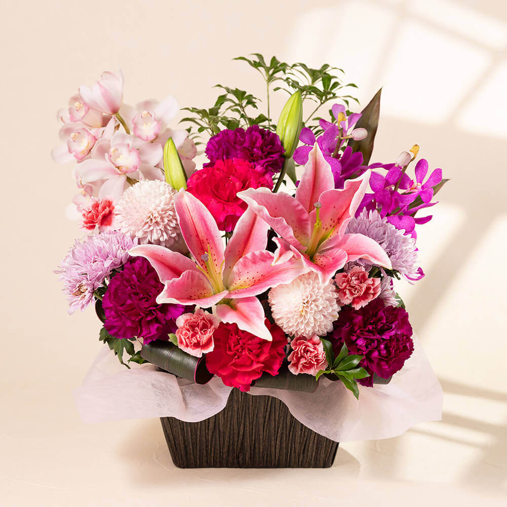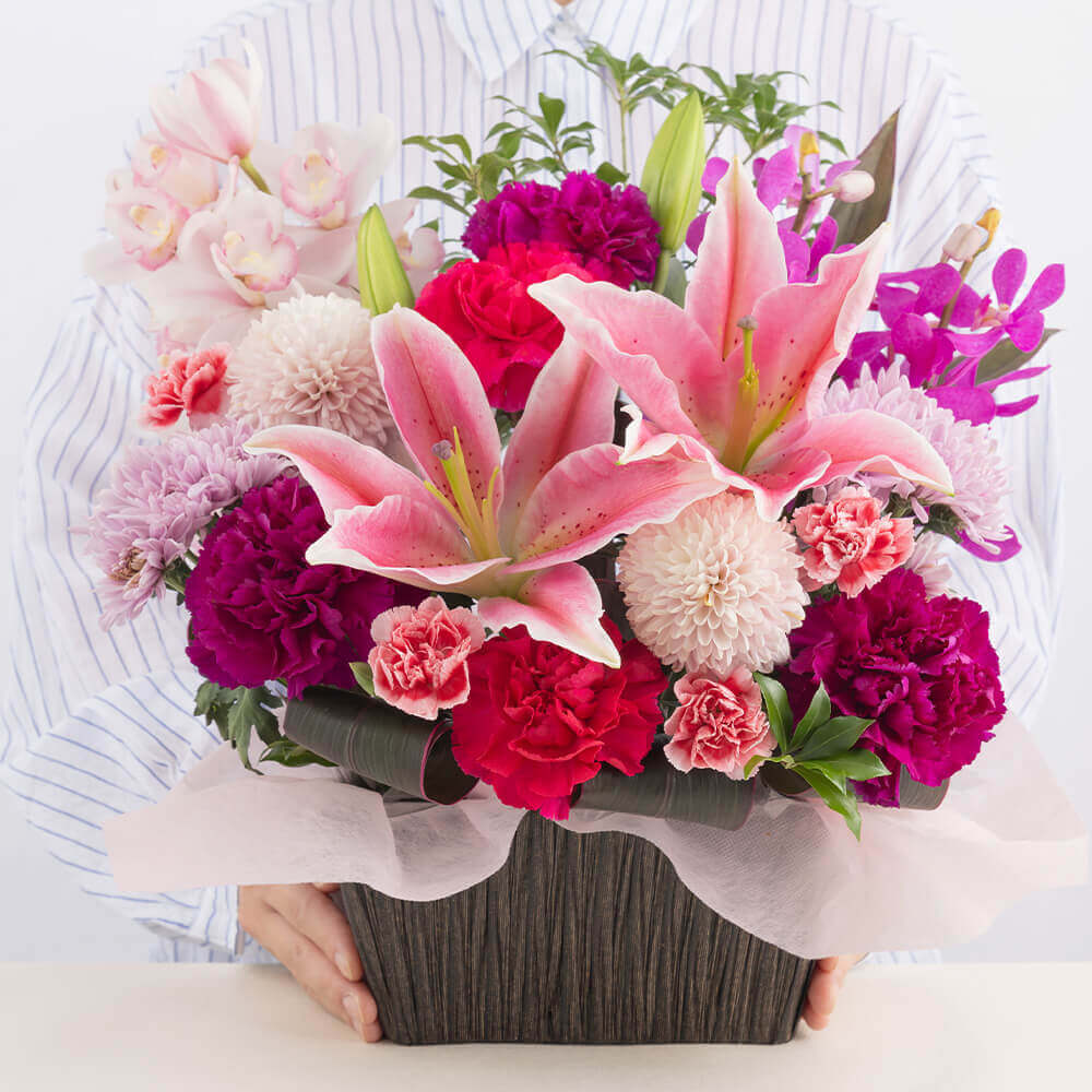 あでやかに咲き誇るオリエンタル百合をメインに、母の日らしいカーネーション、モカラ、スプレーマムなどを和風の籠にアレンジしました。和の伝統にモダンな雰囲気をプラスしたアレンジは、和室でも洋室でも相性が良く、飾る場所を選びません。