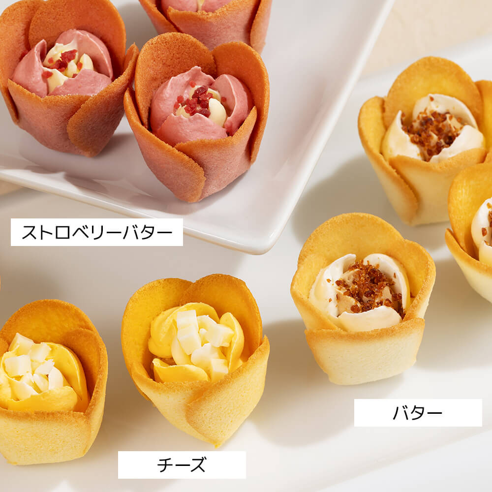 ストロベリーバター:春限定のフレーバー。春色のチューリップラングドシャに、苺のショコラクリームを絞り、ローズを咲かせました。