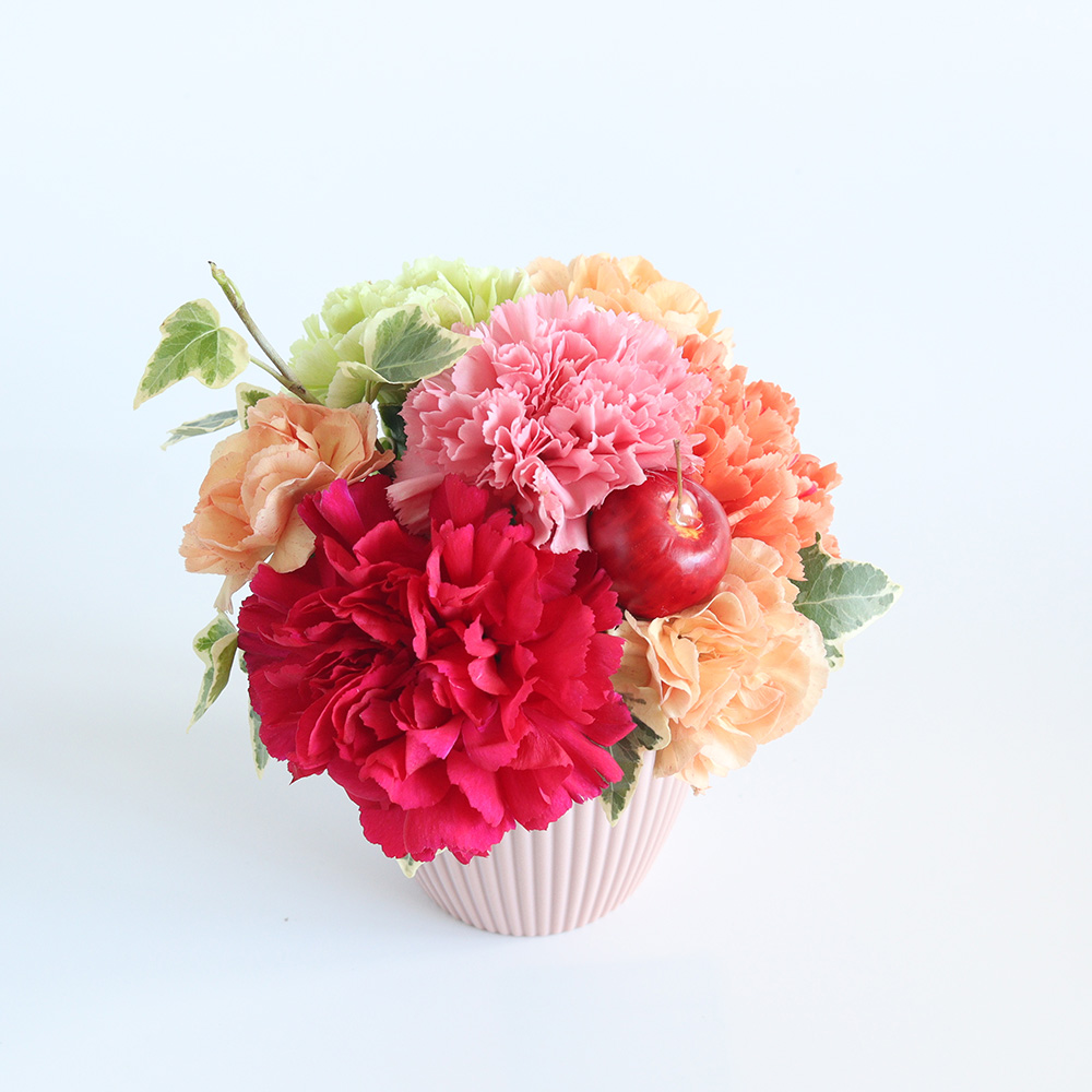 カラフルなミックスカラーのカーネーションのアレンジメントを一緒にお届けします。アクセントに真っ赤なりんごのピックをあしらいました。