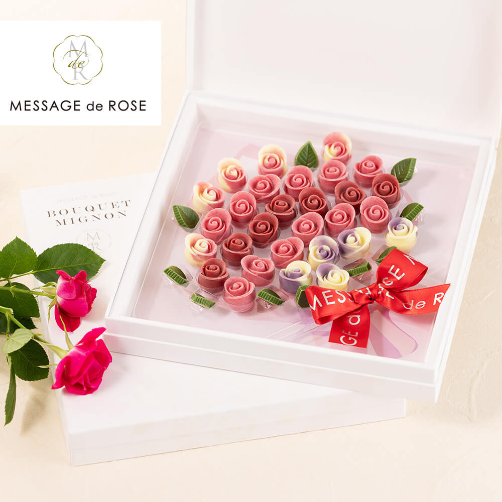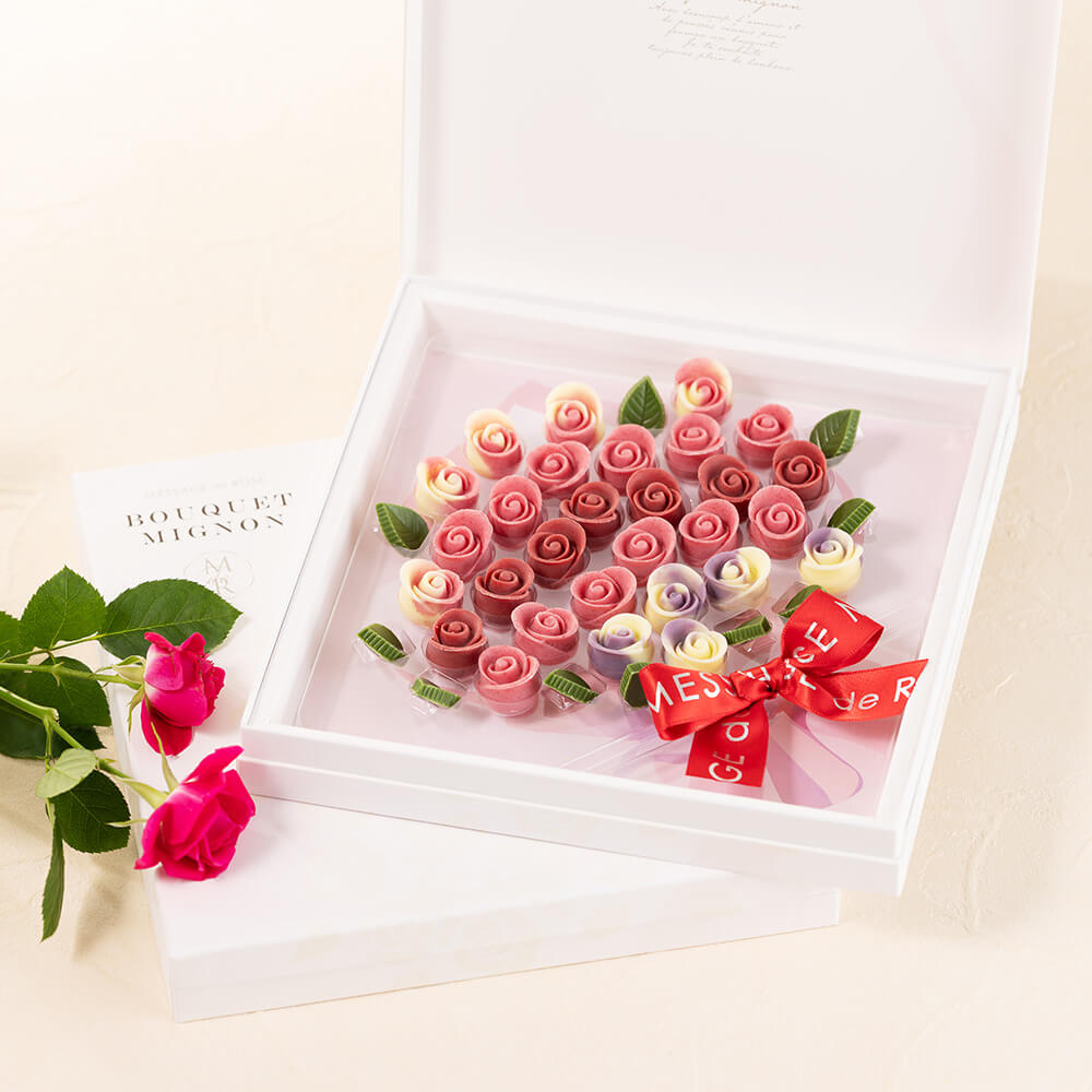 フランス語で「メッセージを贈るバラ」を意味するメサージュ・ド・ローズ。ブランドを象徴するバラのつぼみをモチーフにした「ミニヨン・アドレ」は、一粒一粒が職人のこだわりによって作られた芸術品のようなチョコレートです。
