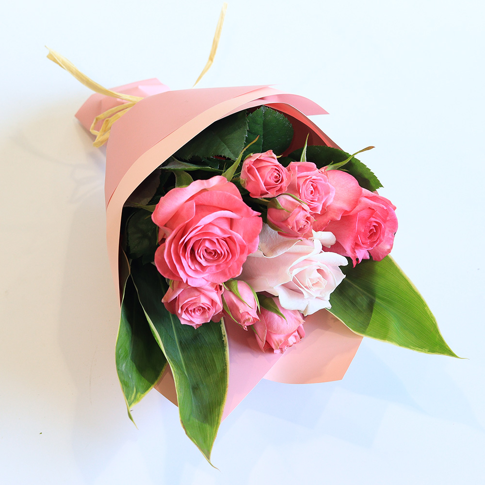 お菓子に合わせてピンク系のグラデーションで組み合わせたバラの花束を一緒にお届けします。お花を飾ればさらに優雅なティータイムになるでしょう。