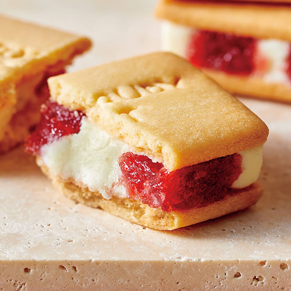 真っ赤な果肉と香り高い甘さが特徴の「イタリア産サブリナ苺」をとろっと煮詰めたコンフィチュールと、練乳ミルクのコクをなめらかに練り上げたホワイトショコラ。ふたつが柔らかなまま合わさった“とろけるダブルメルト製法”の生み出す至福の美味しさを、しっとりしたクッキーでサンドしました。