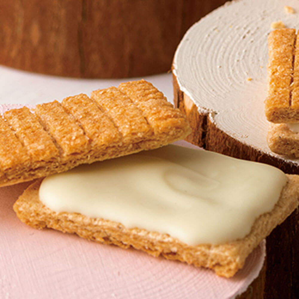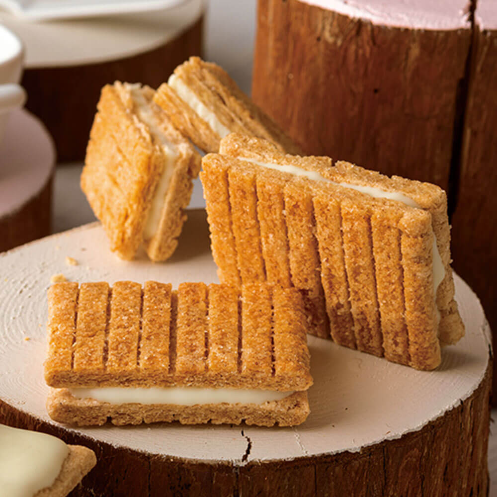 香ばしい生地の間には、ミルキーなホワイトショコラをサンドしました。塩気とショコラの優しい甘さが引き立て合い、後を引く美味しさが広がります。