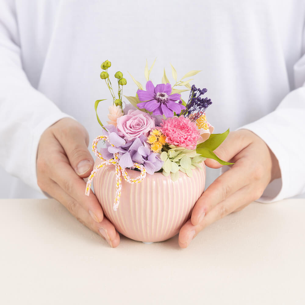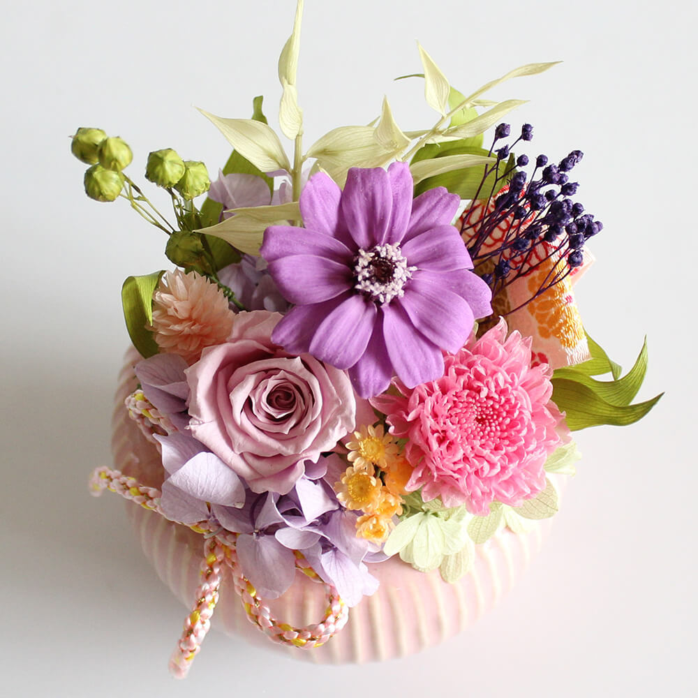 | 花材 | プリザーブドフラワー:バラ、ジニア、小菊、アジサイ、小花、グリーン、モス ドライフラワー:ポアプランツ、リンフラワー、小花 |