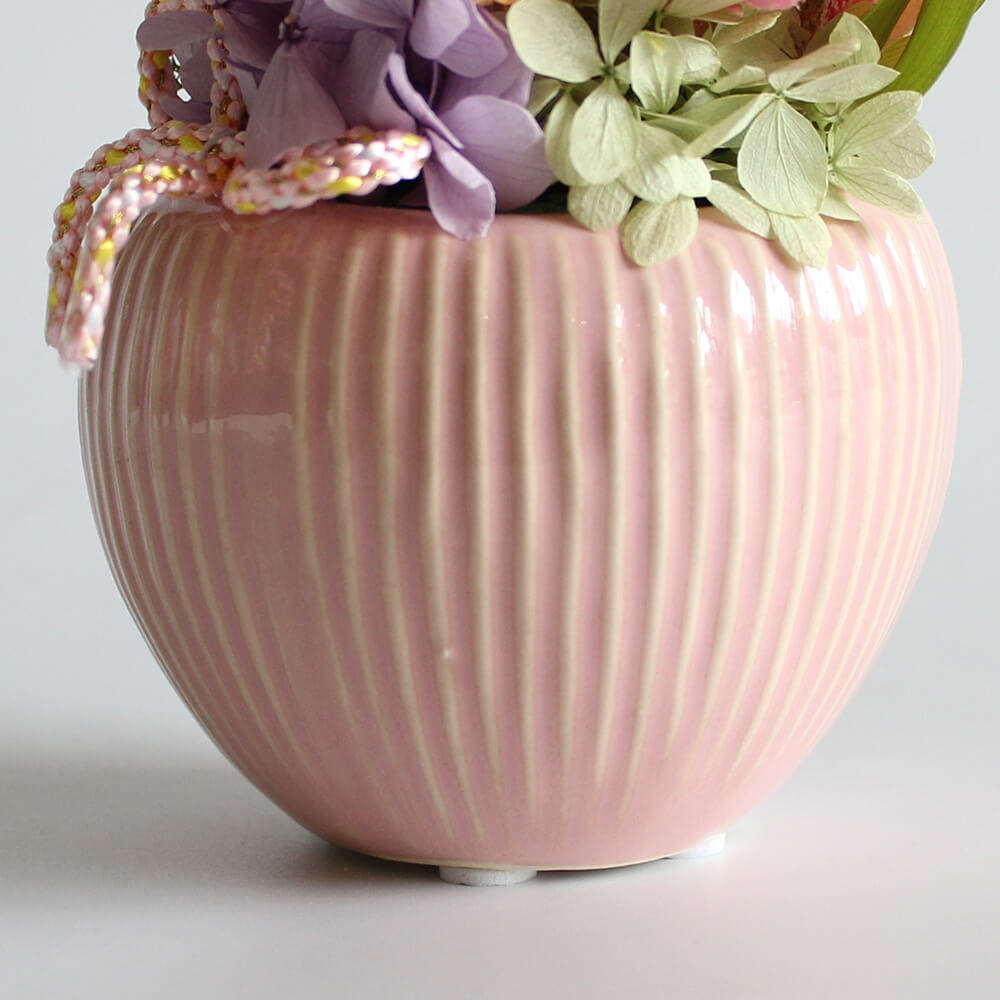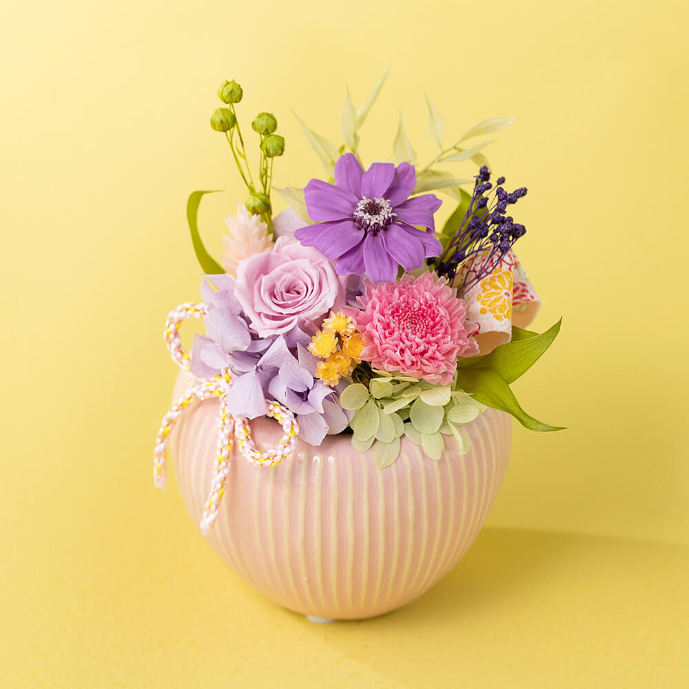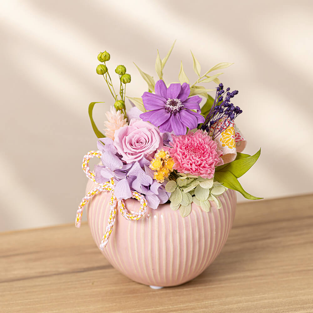今年の母の日は、落ち着きのある「和モダン」なアレンジメントを贈りませんか?愛らしいぷっくりとしたフォルムの陶器に、高貴な色「紫」のジニアや、優美なピンク色のマム(菊)を贅沢にあしらいました。洗練されたデザインですので、和室はもちろん、現代的なリビングの飾り棚や玄関など、どんな空間にもしっとりと馴染んでくれそうです。