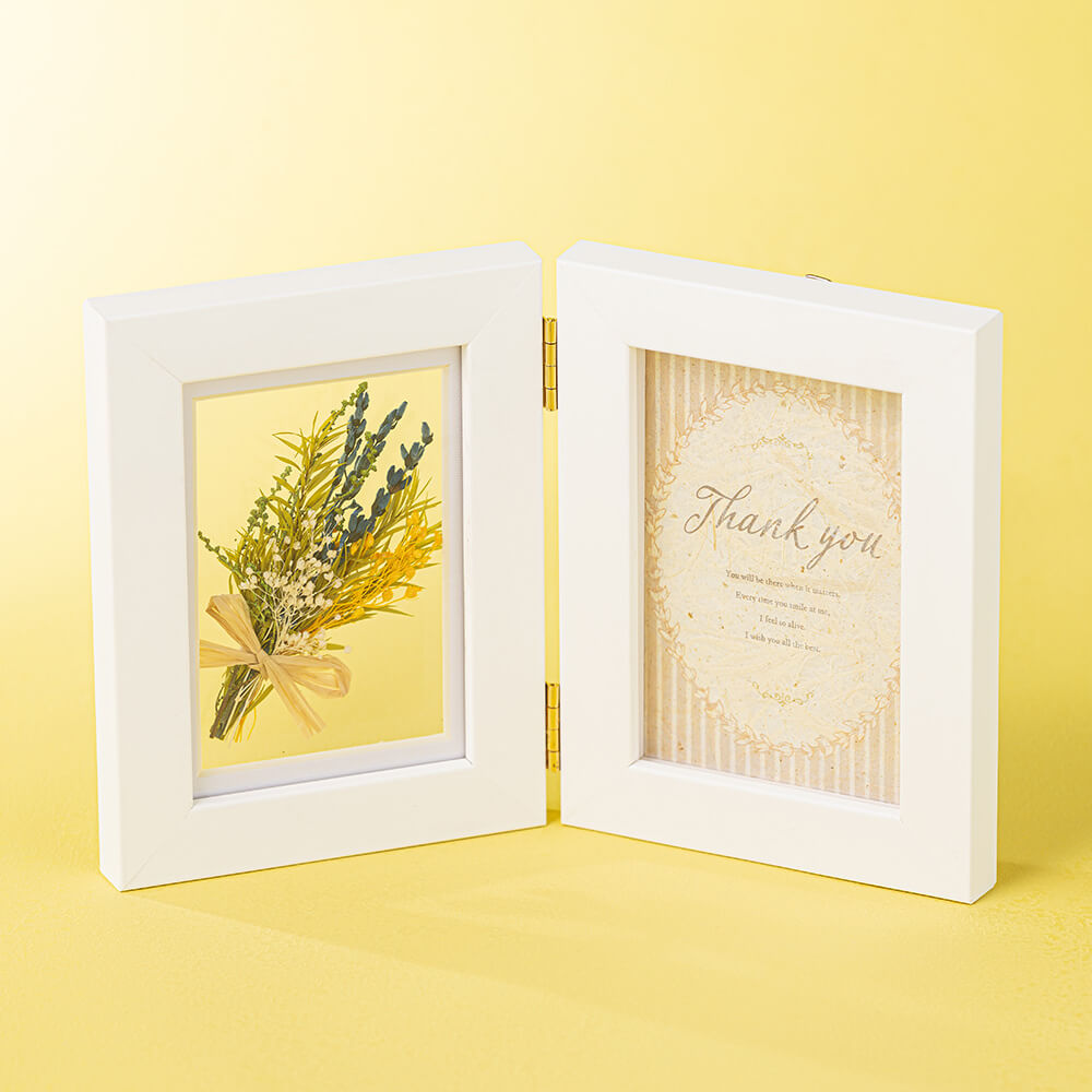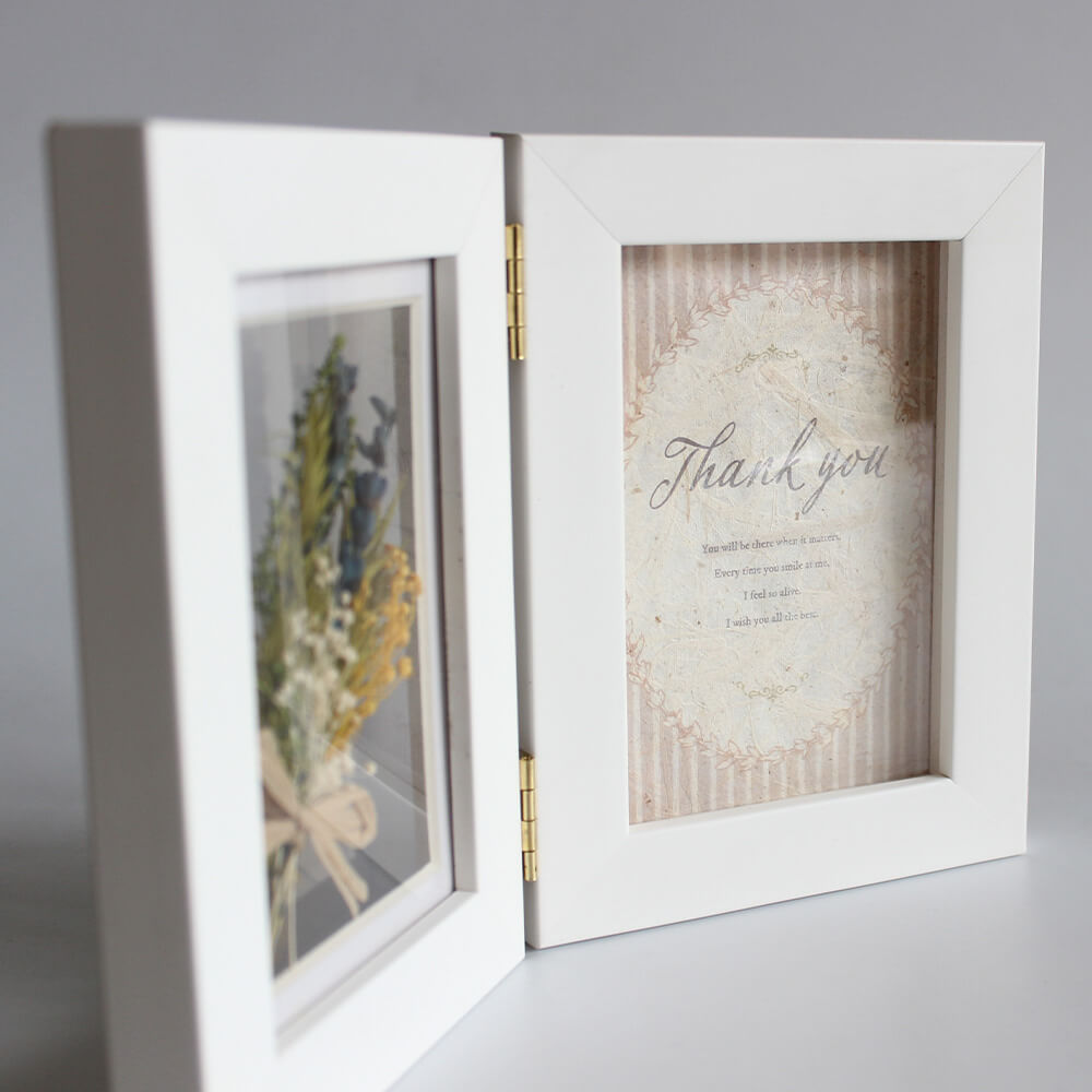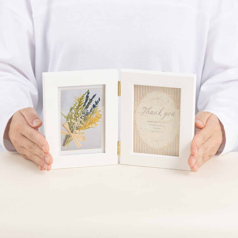 トレンドの標本風にミニブーケを飾った、見開きタイプのフォトフレーム。白ウッドの上品な質感がインテリアに優しく馴染むデザインです。本棚やチェストの上に自立し、開く角度を自由に調整できるため、飾る場所を選びません。左側には、ラベンダーを主役にしたミニブーケ。ラベンダー特有の繊細なシルエットと、落ち着いたパープルの色彩を、標本のように長く楽しむことができます。