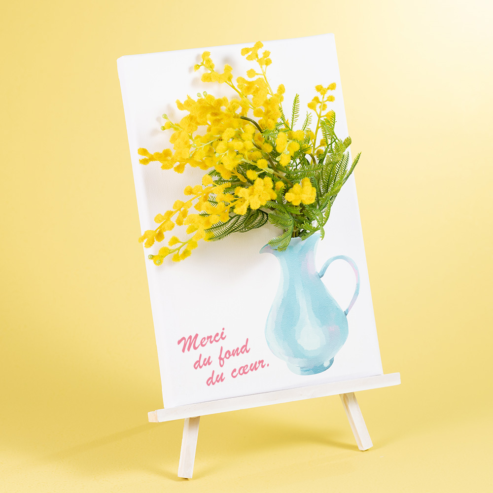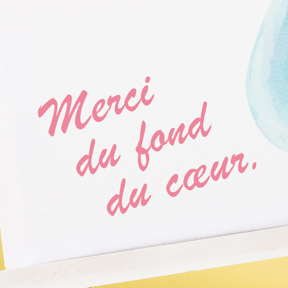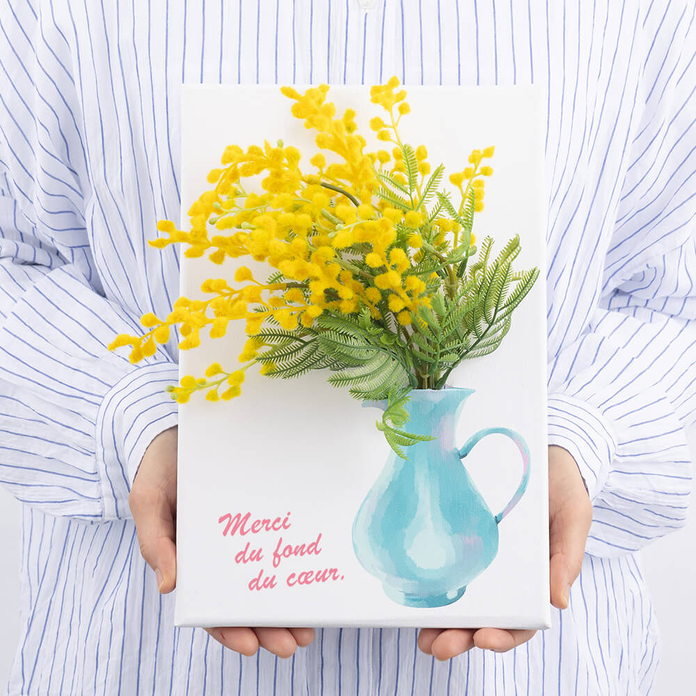 油絵風に描いたオリジナルのフラワーベースに、色鮮やかなブルーのアートフラワーをデザインし、「心からありがとう」を意味するフランス語をサインのように書き添えました。イラストはキャンバス風のファブリックボードに専用の機械でプリントされています。壁のピクチャーレールや押しピンに、ボード背面のくぼみをひっかけると、まるで絵画を飾ったような雰囲気に。