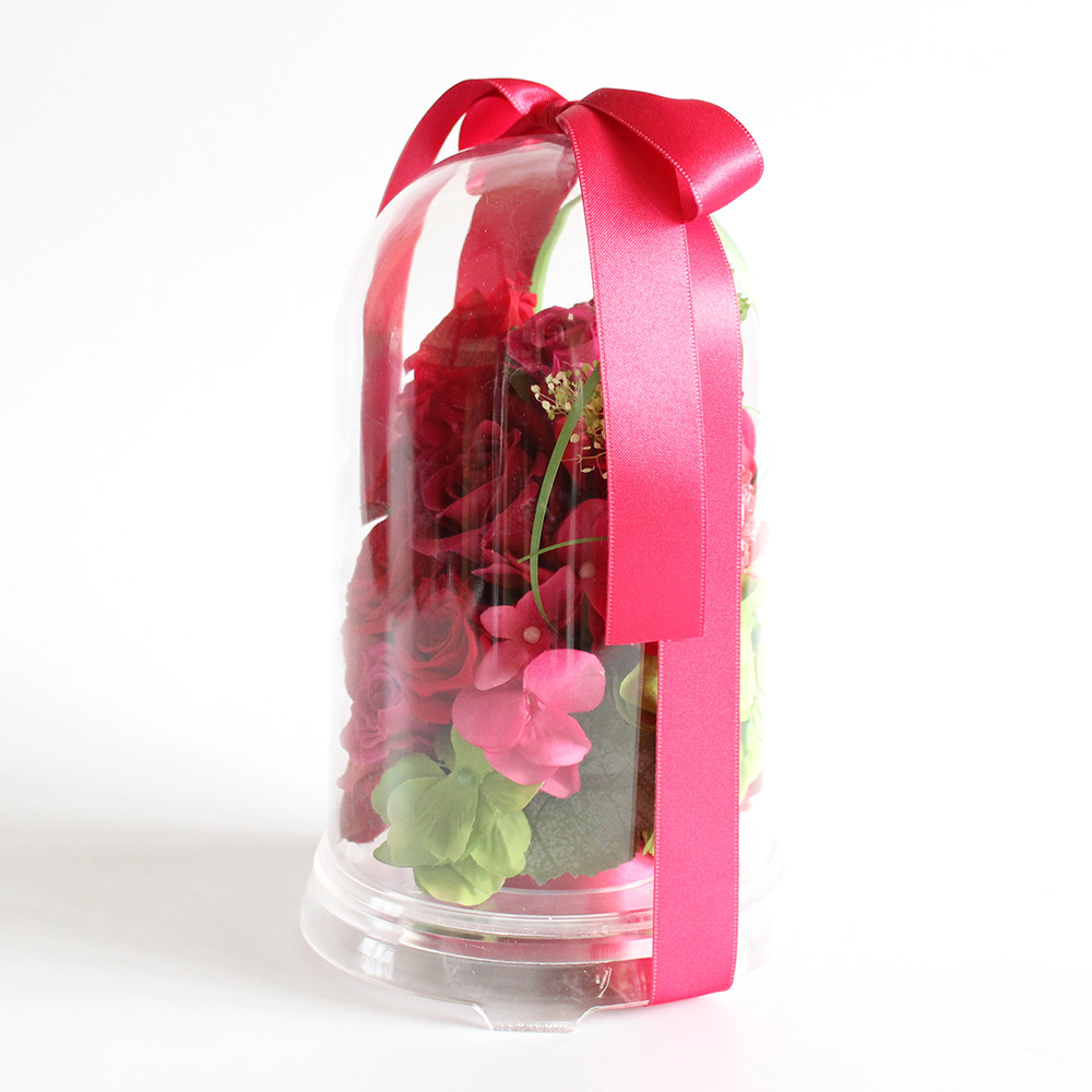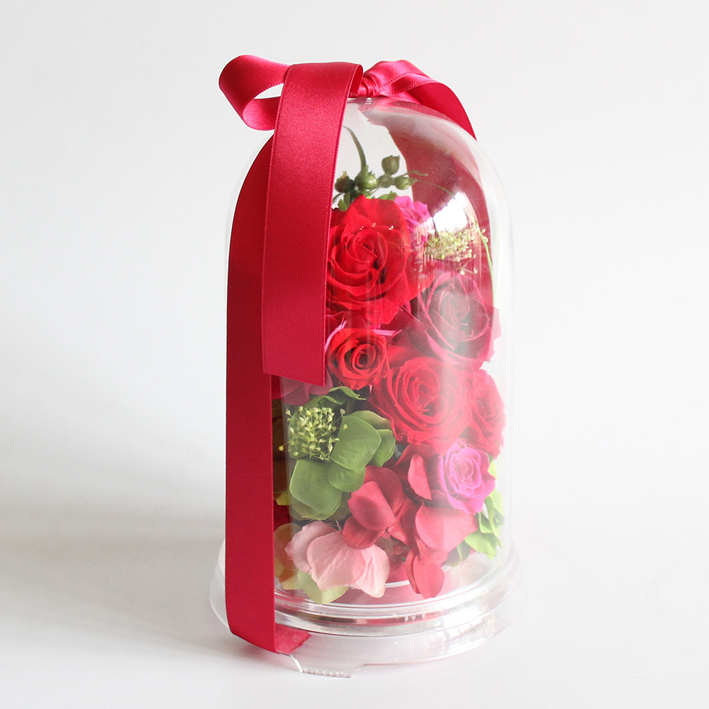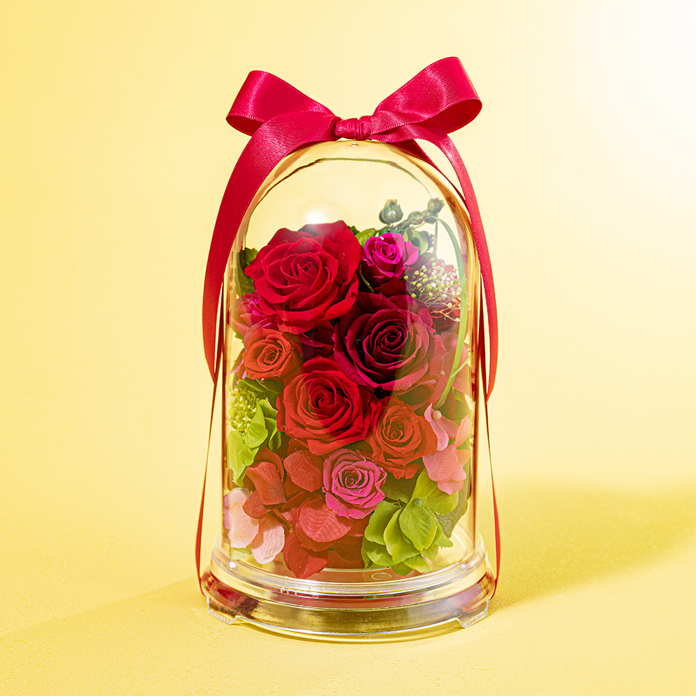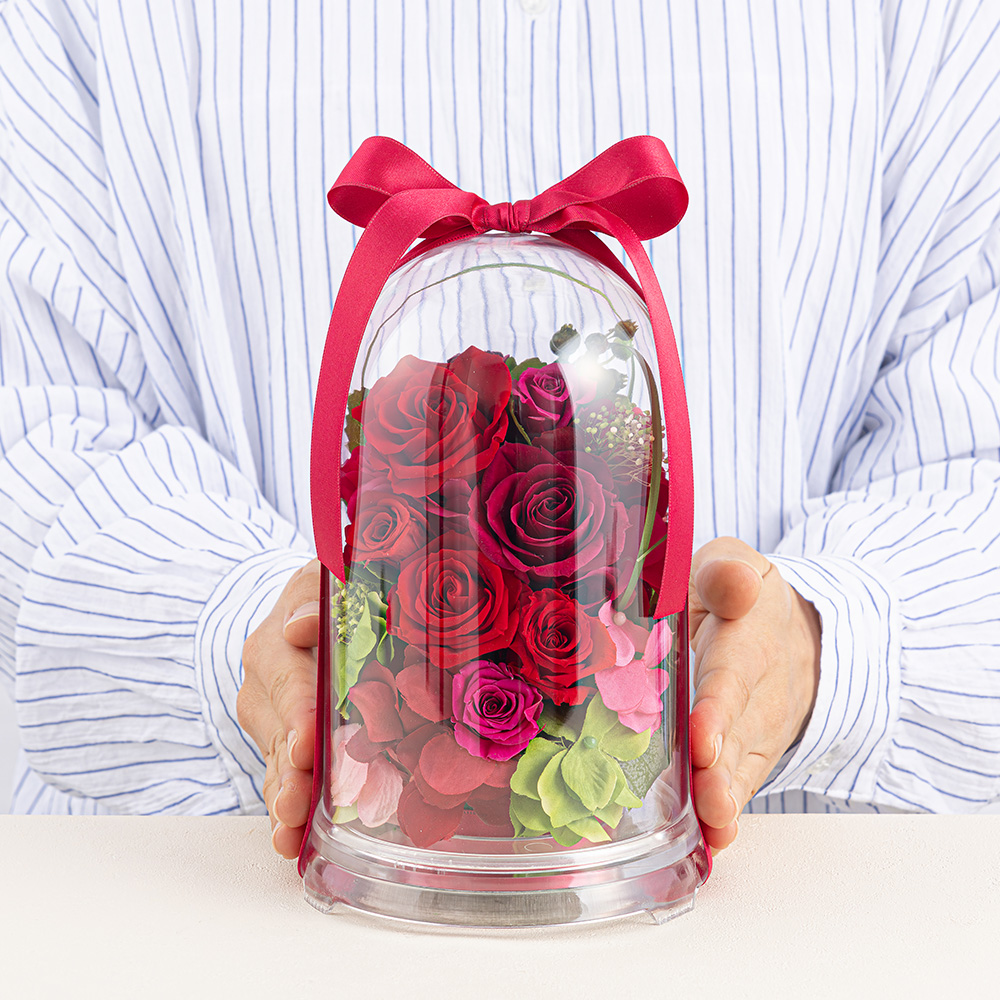 箱を開けた瞬間、目に飛び込んでくるのは、情熱と感謝の象徴である真紅のバラ。ドームいっぱいに贅沢な赤のグラデーションの花々を敷き詰めた、どこから見ても美しい360度デザインです。軽量で耐久性に優れた「割れない素材」のドームですので、小さなお子様やペットのいるご家庭でも、場所を選ばず安心して飾っていただけます。