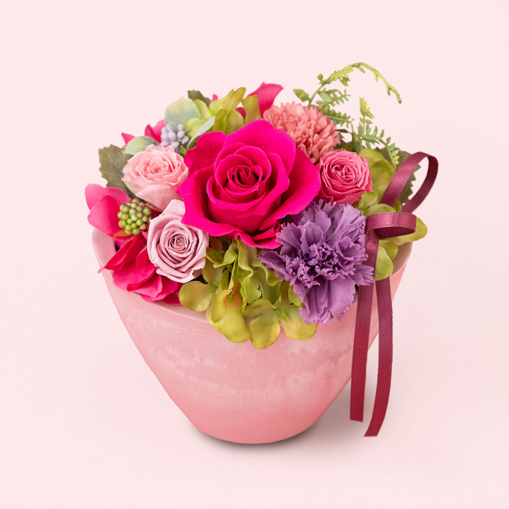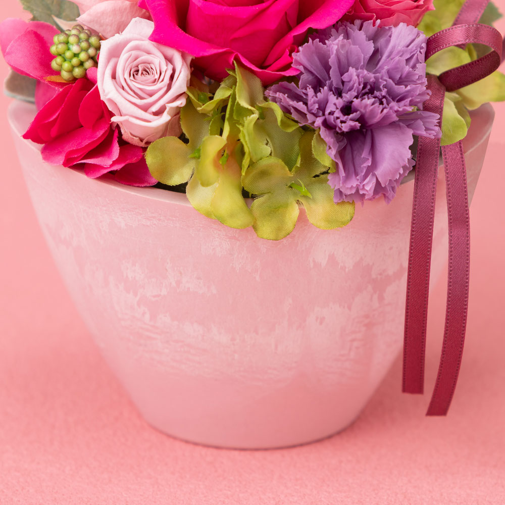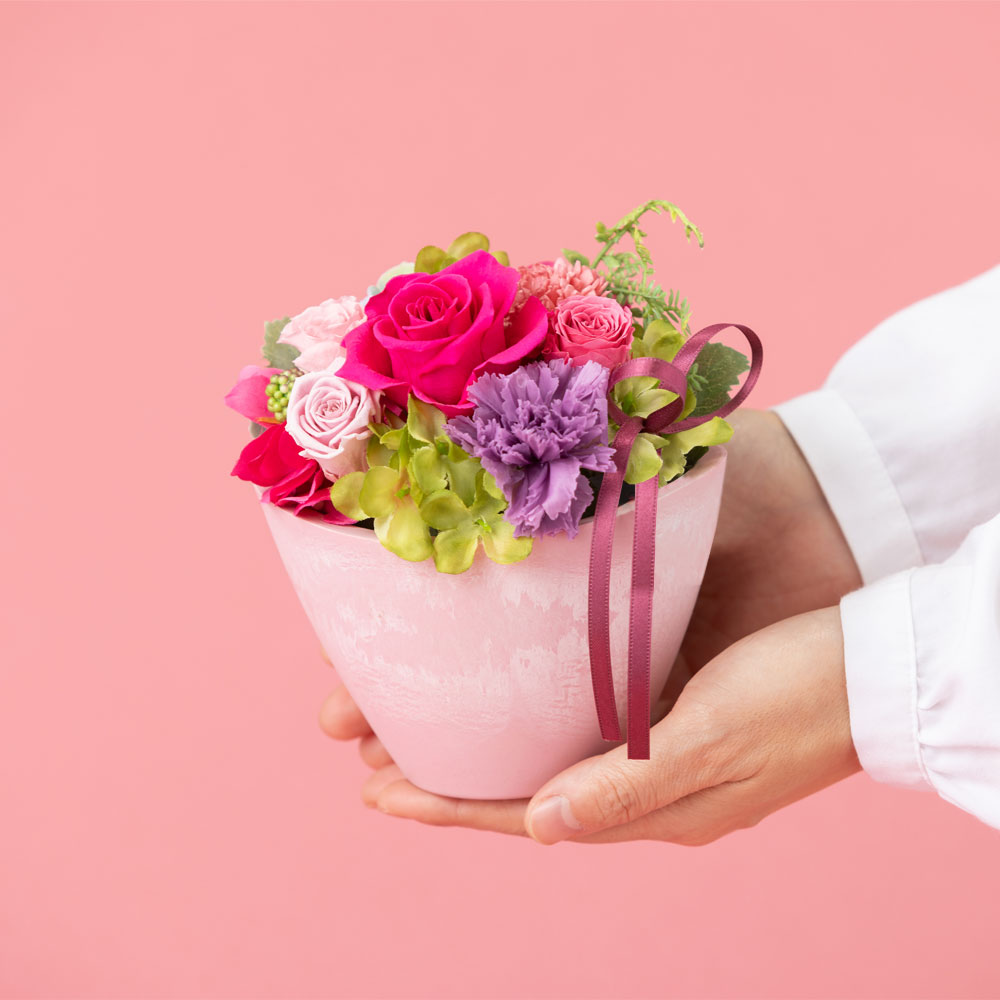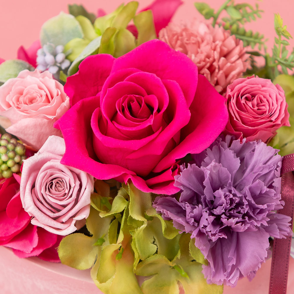 美しく開花したフューシャピンクのバラと、「気品」の花言葉を持つ紫色のカーネーションが目を惹くアレンジメントです。ピンク、パープル、グリーンを組み合わせた優美な花々は、エレガントなピンクが好きなお母さんや、自分磨きをしているお母さんへの贈り物にぴったり。華やかで見るたびにっこり笑顔を見せてくれそうです。母の日に贈りたいカーネーションは、プリザーブドフラワーとドライフラワー、2種類使いました。