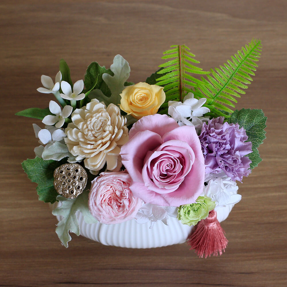 ※こちらの商品は、プリザーブドフラワーの他、ドライフラワー、アーティフィシャルフラワー等を使用し、異なる素材を組み合わせたデザインです。