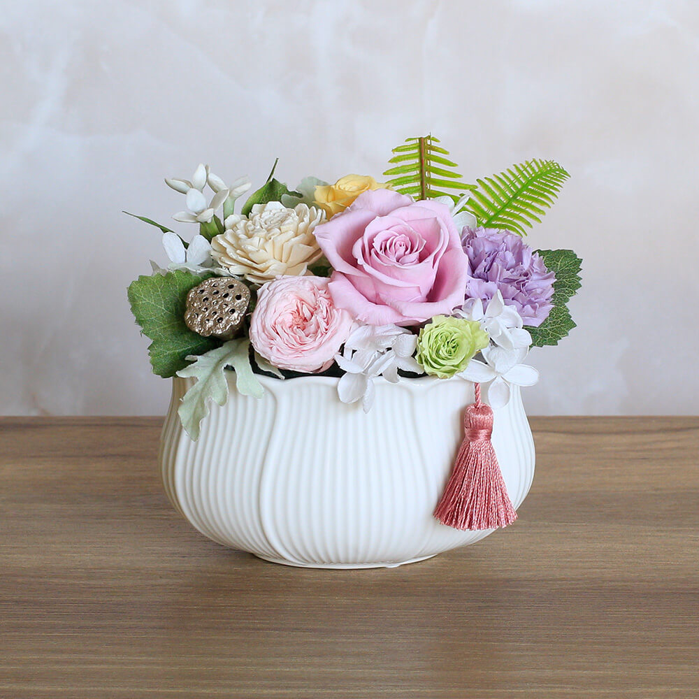 | 資材 | タッセル、陶器製花器、クリアケース入り、お手入れ説明付き |