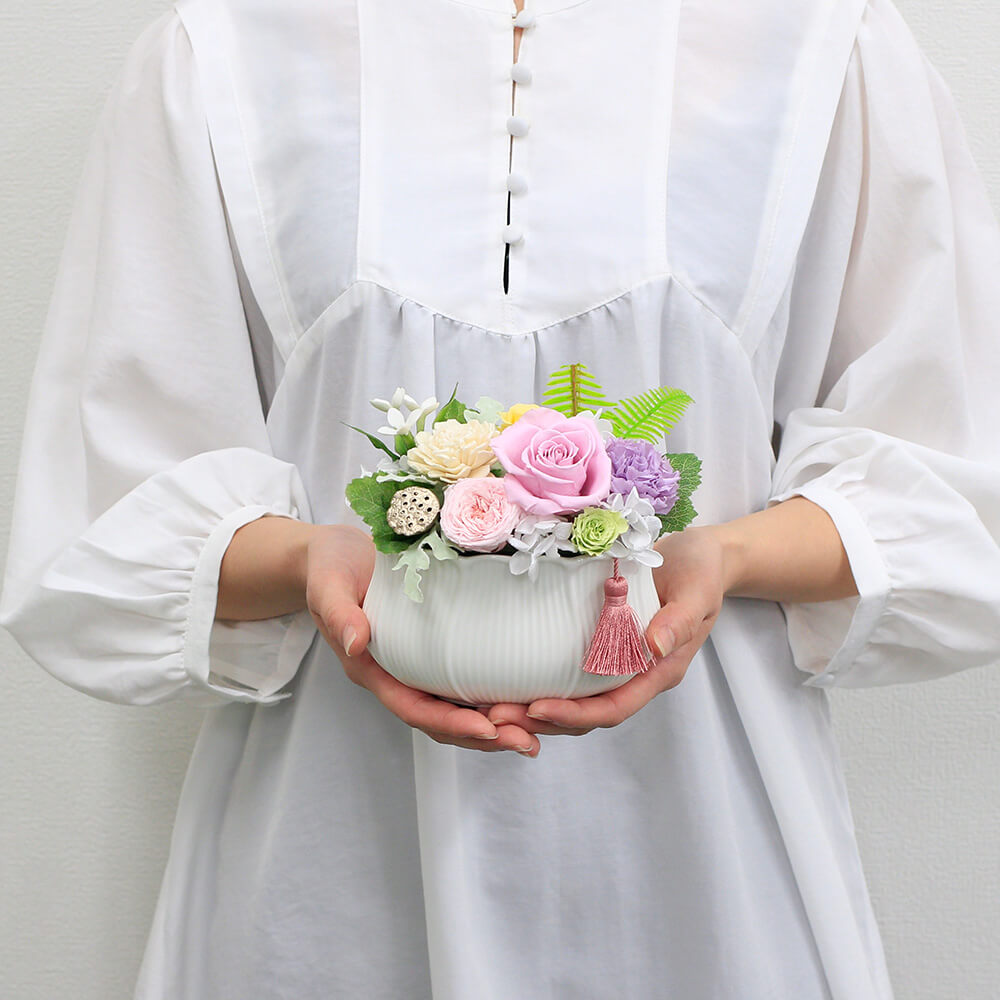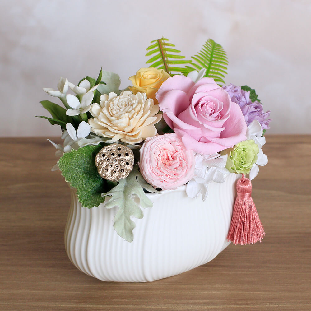 | 資材 | タッセル、陶器製花器、クリアケース入り、お手入れ説明付き |
