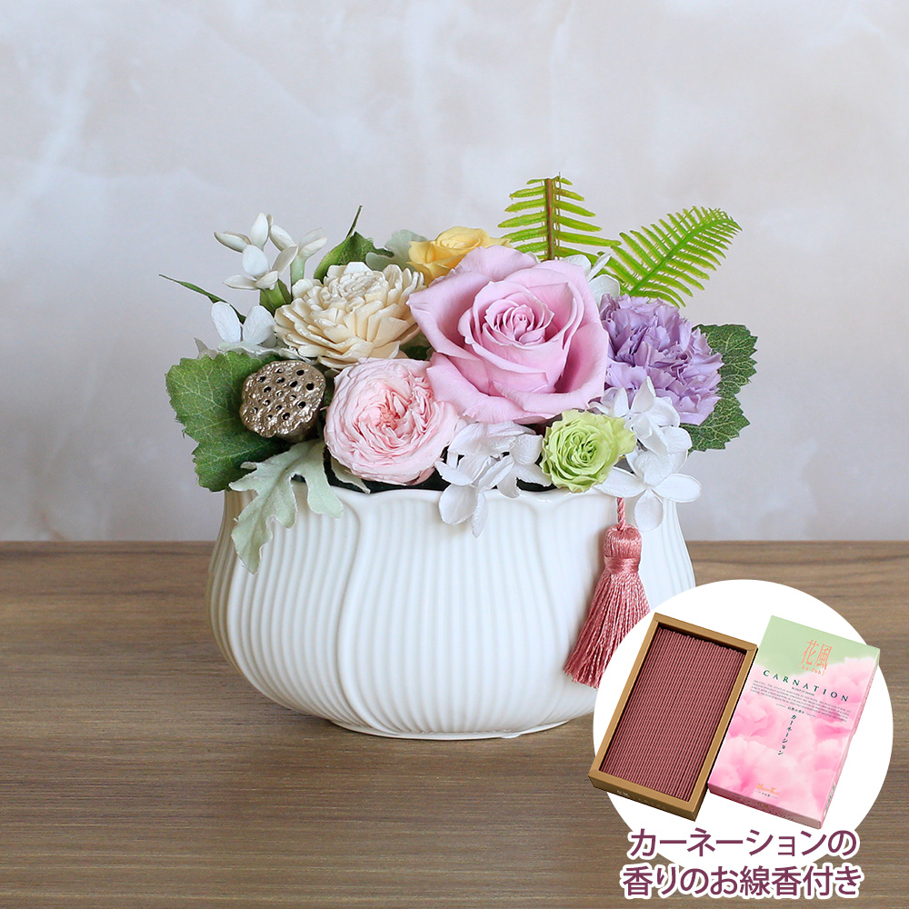お供え花 プリザーブドフラワー「雫〜ラベンダーピンク〜」お線香付きのオススメポイント