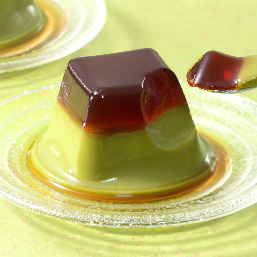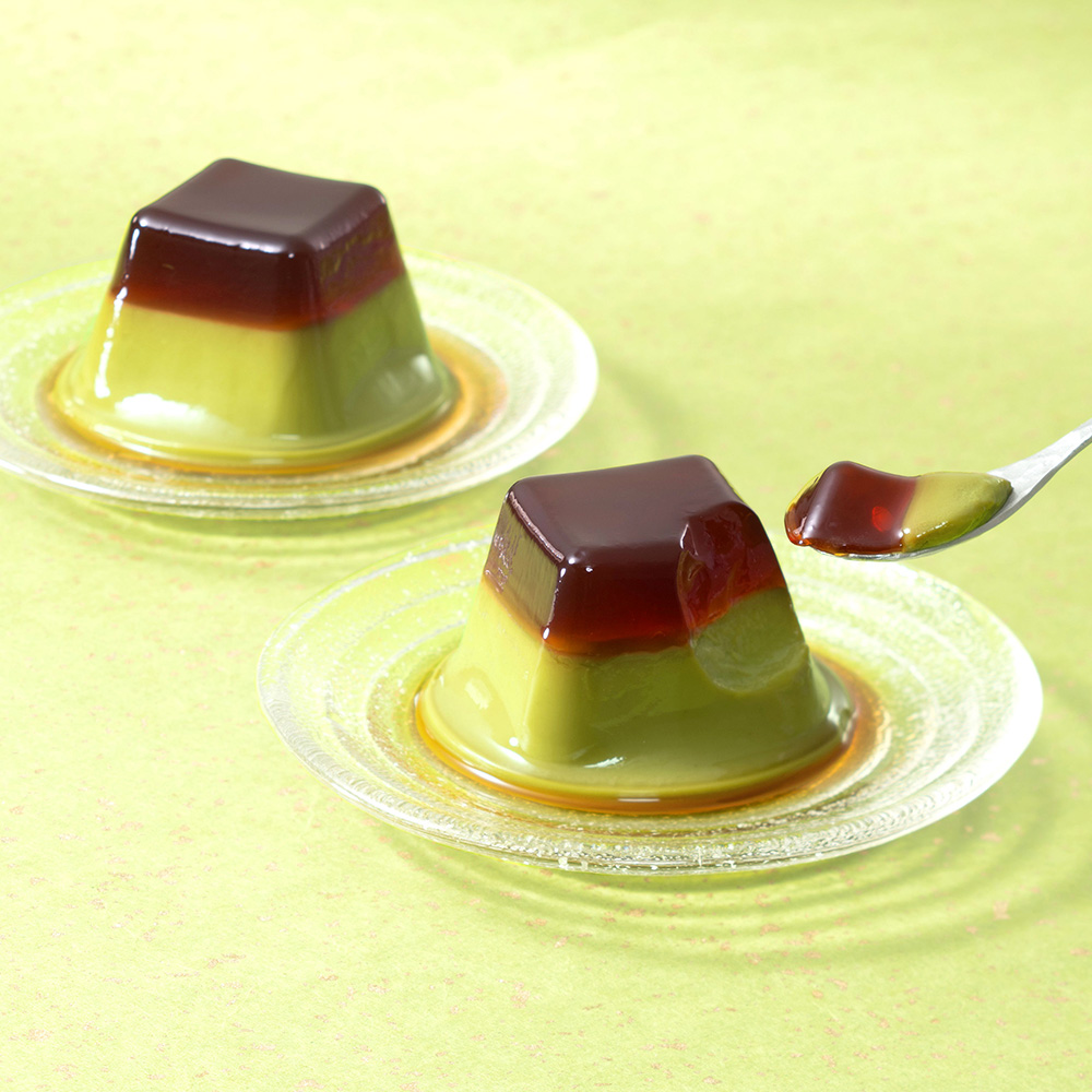 ぷるんとした、上品な甘さのコクある黒糖ゼリーに、わらび粉を使用した口どけなめらかな宇治抹茶プリンを重ねたモダンなデザートです。ぷるんと涼やかな味わいの黒糖ゼリーとキメの細かいふんわりくちどけの抹茶プリンは、一緒に食べるとより深い味わいになります。黒糖ゼリー、抹茶プリンの層はそれぞれ口当たりの違いも楽しめるので、1つで2度美味しいこだわりの涼味菓子となっています。