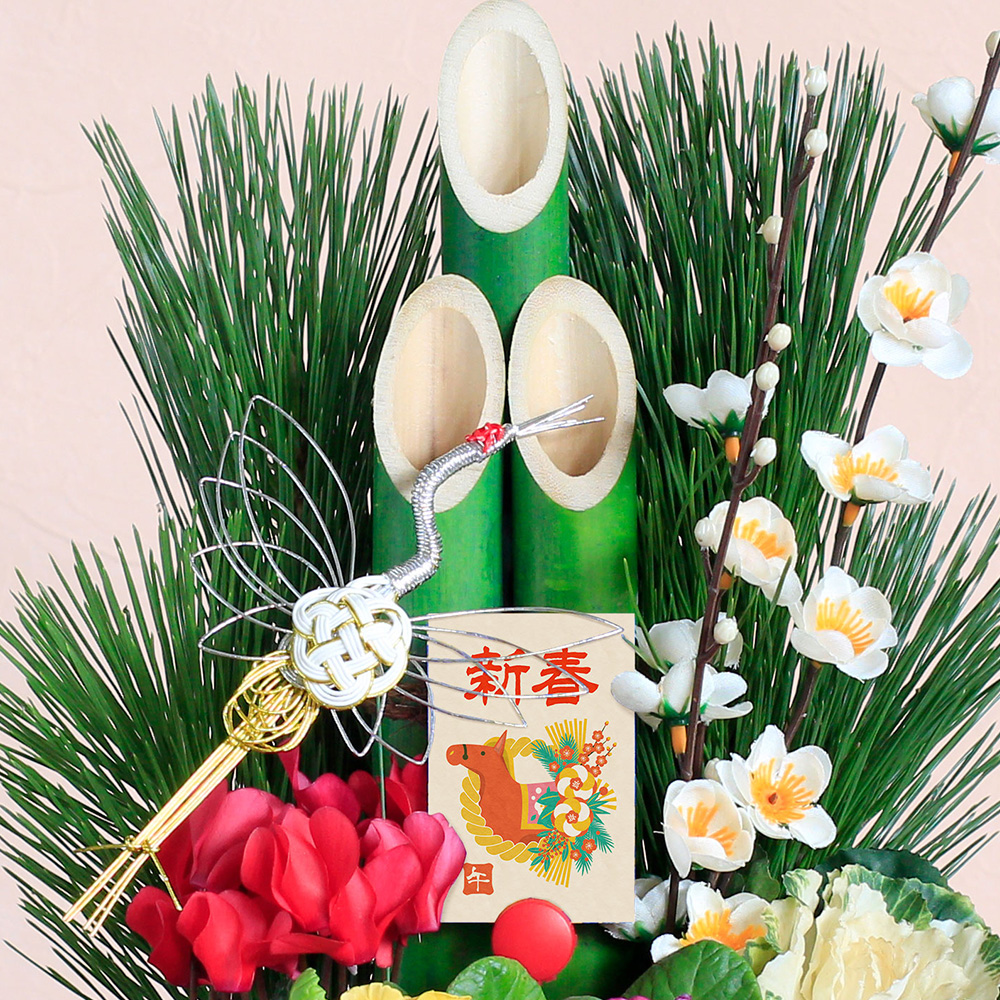 | 資材 | 天然竹3本組み(※自然の竹を使用していますので、色ムラ・シミなどがある場合がありますが、自然の風合いとしてお楽しみください)、梅枝(フェイクフラワー)、水引鶴ピック、お正月ピック、プラスチック製鉢、栽培説明書付き |