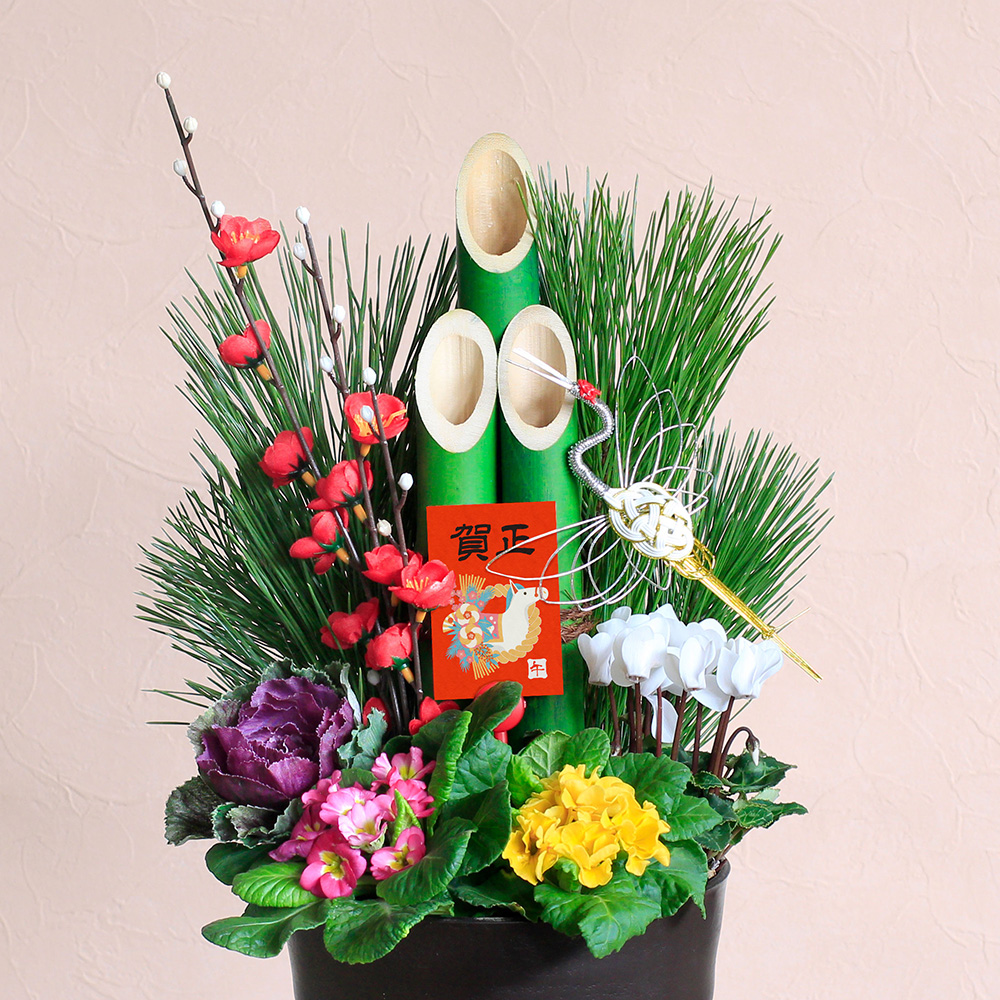 お正月飾りの代表ともいえる門松。「神様が下りてくる所」という意味を持ち、日本では室町時代の頃から玄関の飾りとされてきました。お正月には欠かせない門松を今時の洋風なおうちにも相性がいいようにアレンジしました。玄関にちょうど一対で飾れるように左右対称に植え込んでいます。縁起が良いものの代名詞にもなっている松竹梅に、ガーデンシクラメン、葉牡丹、ジュリアンを加えた、厳かでありながら華やかに新年を迎えるのにふさわしいモダンでお洒落な門松です。