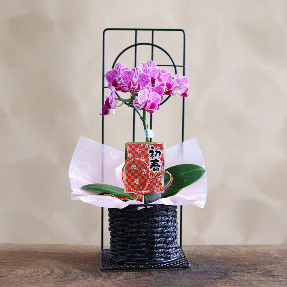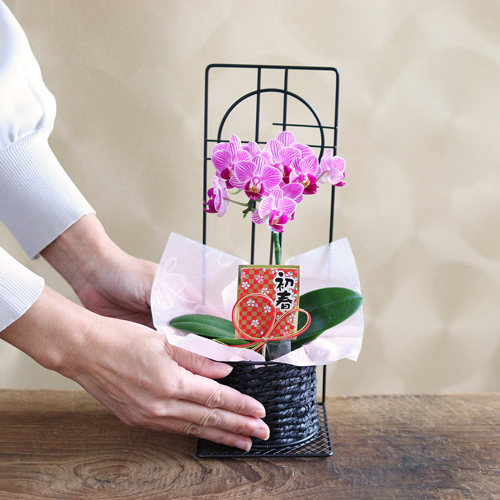 新春の贈り物にふさわしい明るく華やかな胡蝶蘭。和室や床の間はもちろん、テーブルサイズの胡蝶蘭なので、玄関のシューズボックスの上などの少スペースでも楽しんでいただけます。