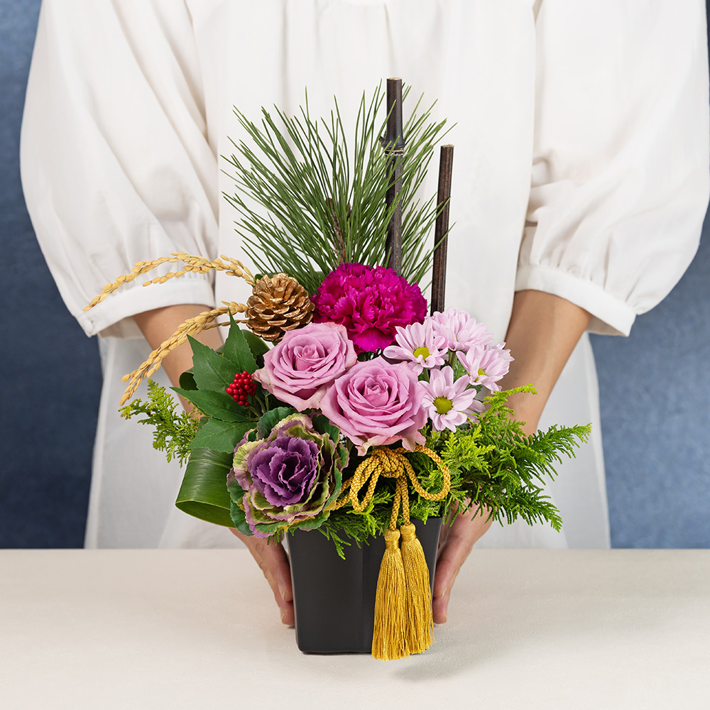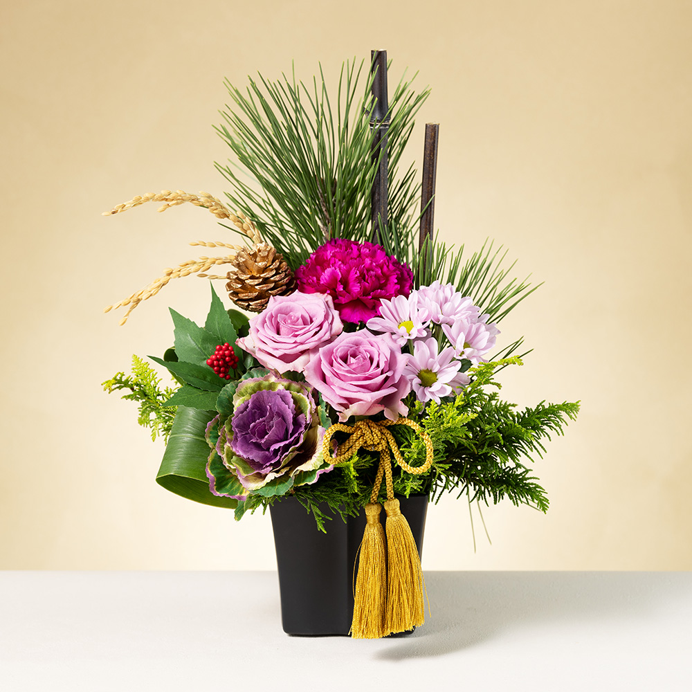 紫のバラをメインに葉牡丹やカーネーション、スプレーマムなど上品な色合いの花々をアレンジしました。実りある1年を願う稲穂や折れにくい強さと成長の速さから生命力の強さの象徴である竹が、お正月気分を盛り上げます。