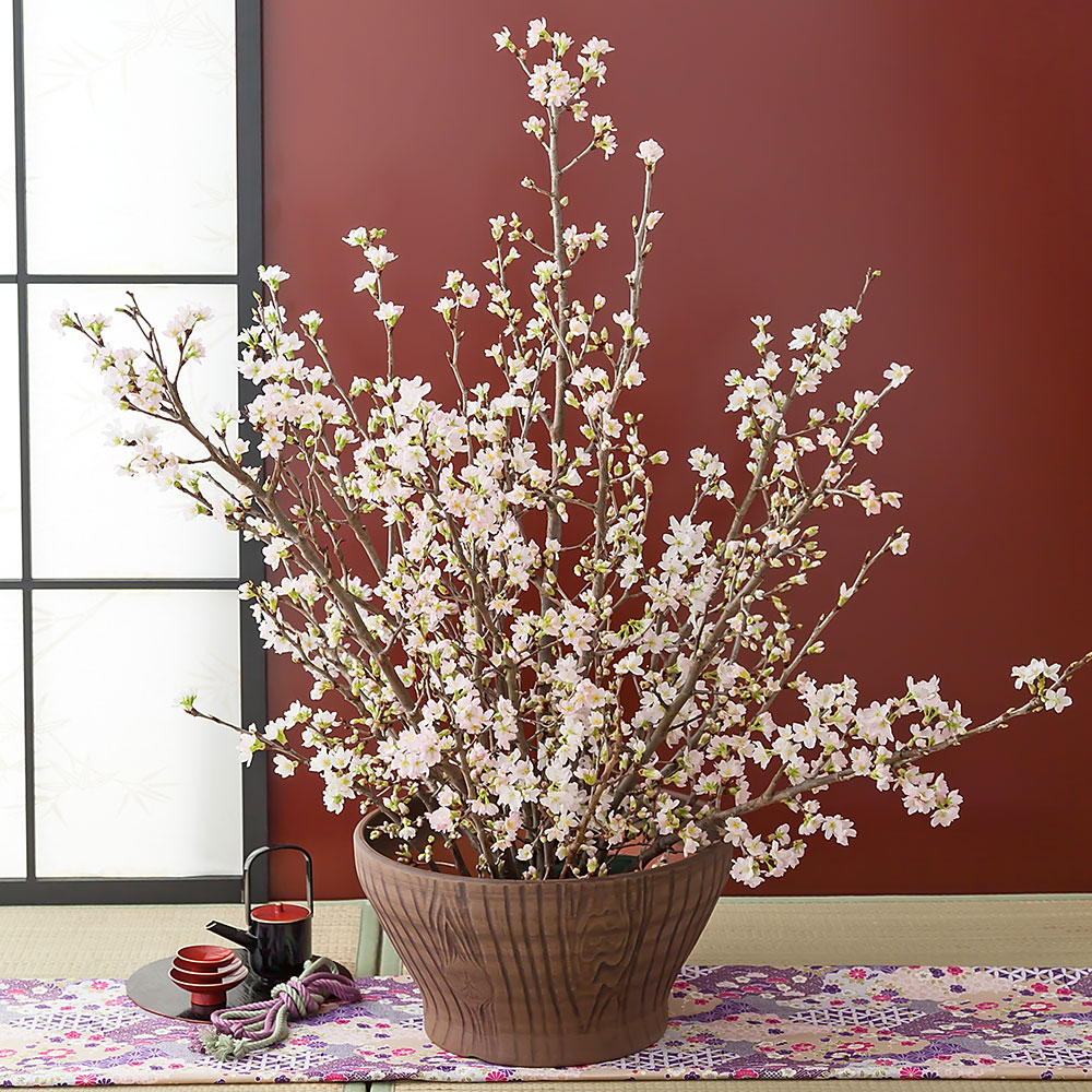ひと足早く花を咲かせる「みちのく初桜〜啓翁桜」の歴史は古く、江戸城に生花を納めていた花き商人が冬に咲かせる手法を編み出したと言われています。桜は秋になって気温が下がり始めると休眠に入ります。夏から秋にかけて昼夜の温度差が大きい東北(山形県)の環境と栽培技術により、お正月に開花を合わせた状態でお届けいたします。早く咲かせたい場合はリビングなどの暖かい室内、じっくり咲かせたい場合は玄関など肌寒い室内に飾ってください。