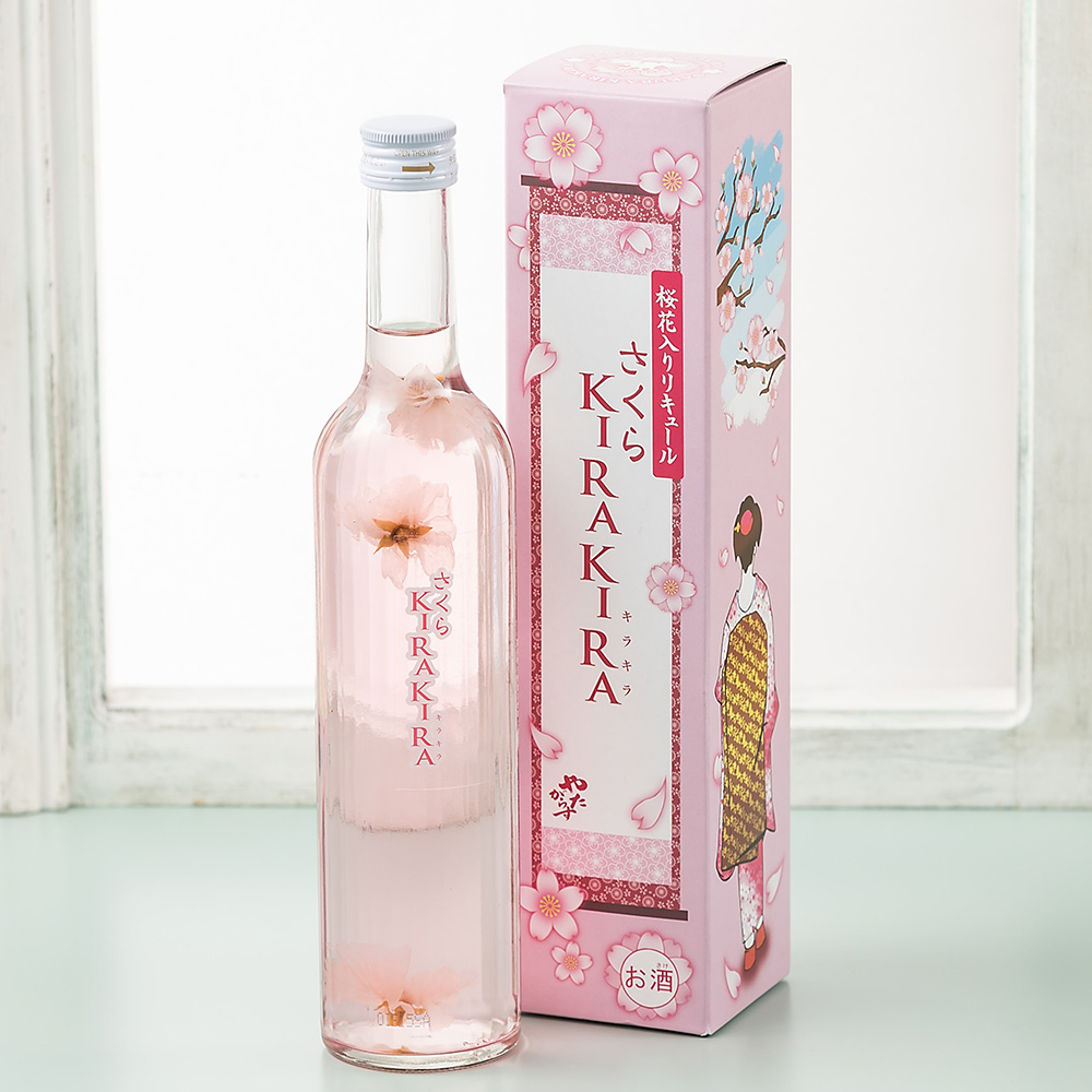 ボトルの中で桜花満開の香り漂う甘酸っぱいリキュールをお届けします。万華鏡をイメージしたボトルの中には桜が3輪入っています。
