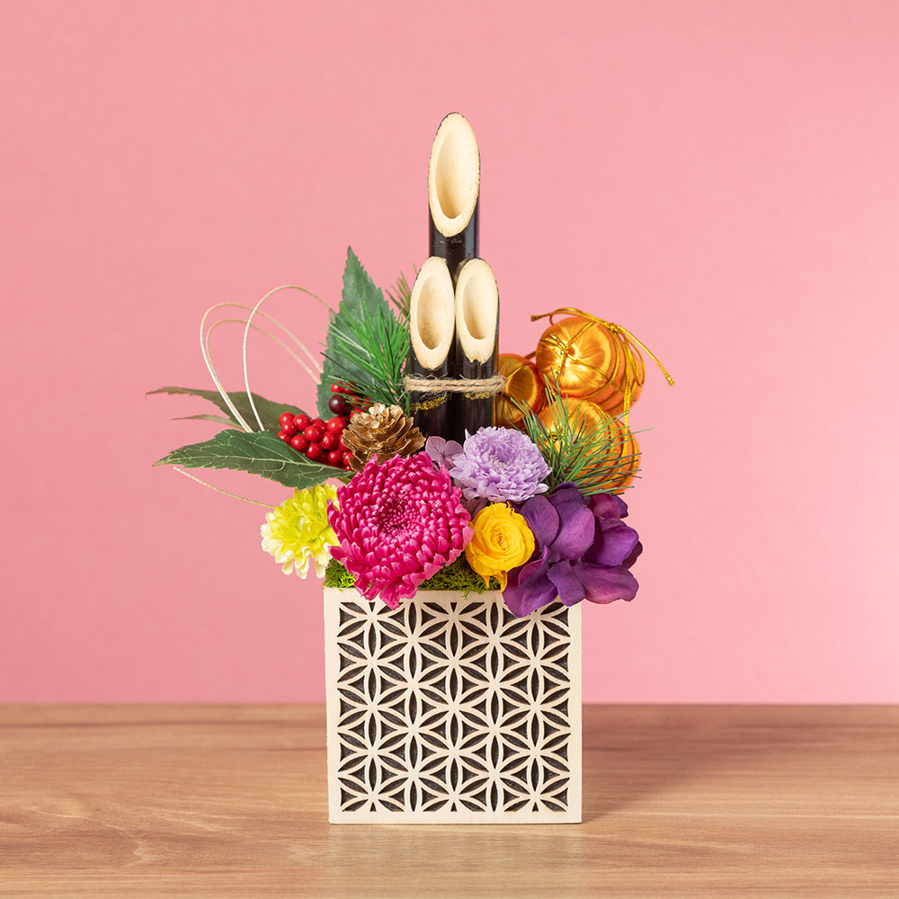 | 花材 | プリザーブドフラワー:輪菊、小菊、ミニバラ、アジサイ、モス ドライフラワー:天然竹3本組み、カラマツ アートフラワー:松、千両、マム、アジサイ |