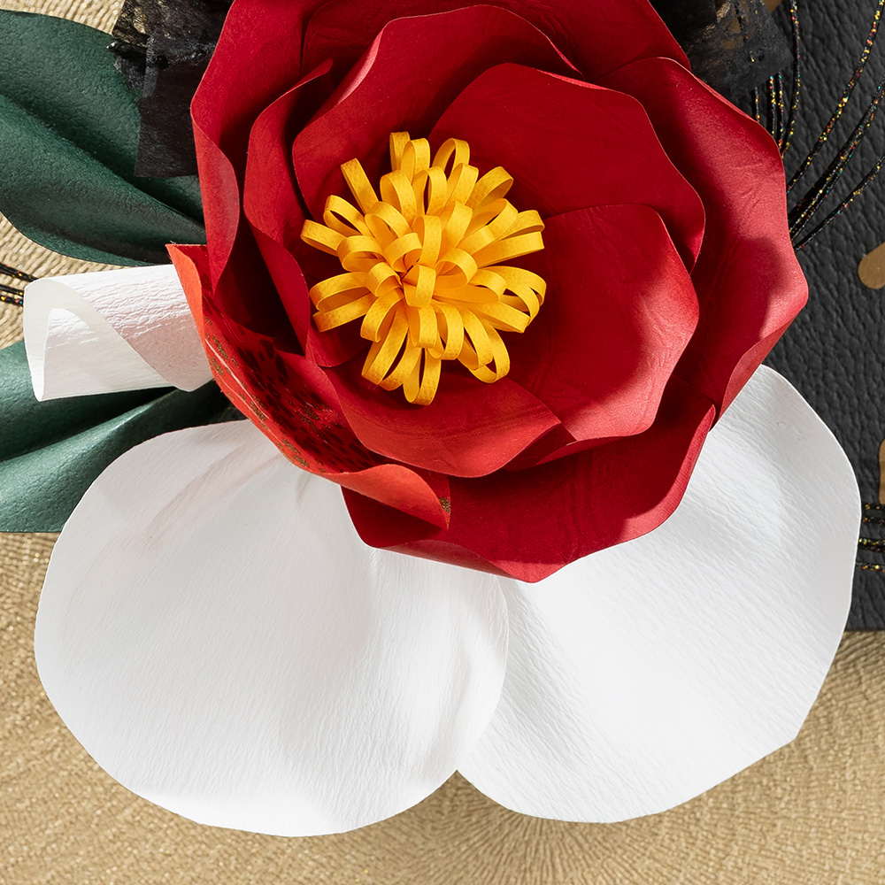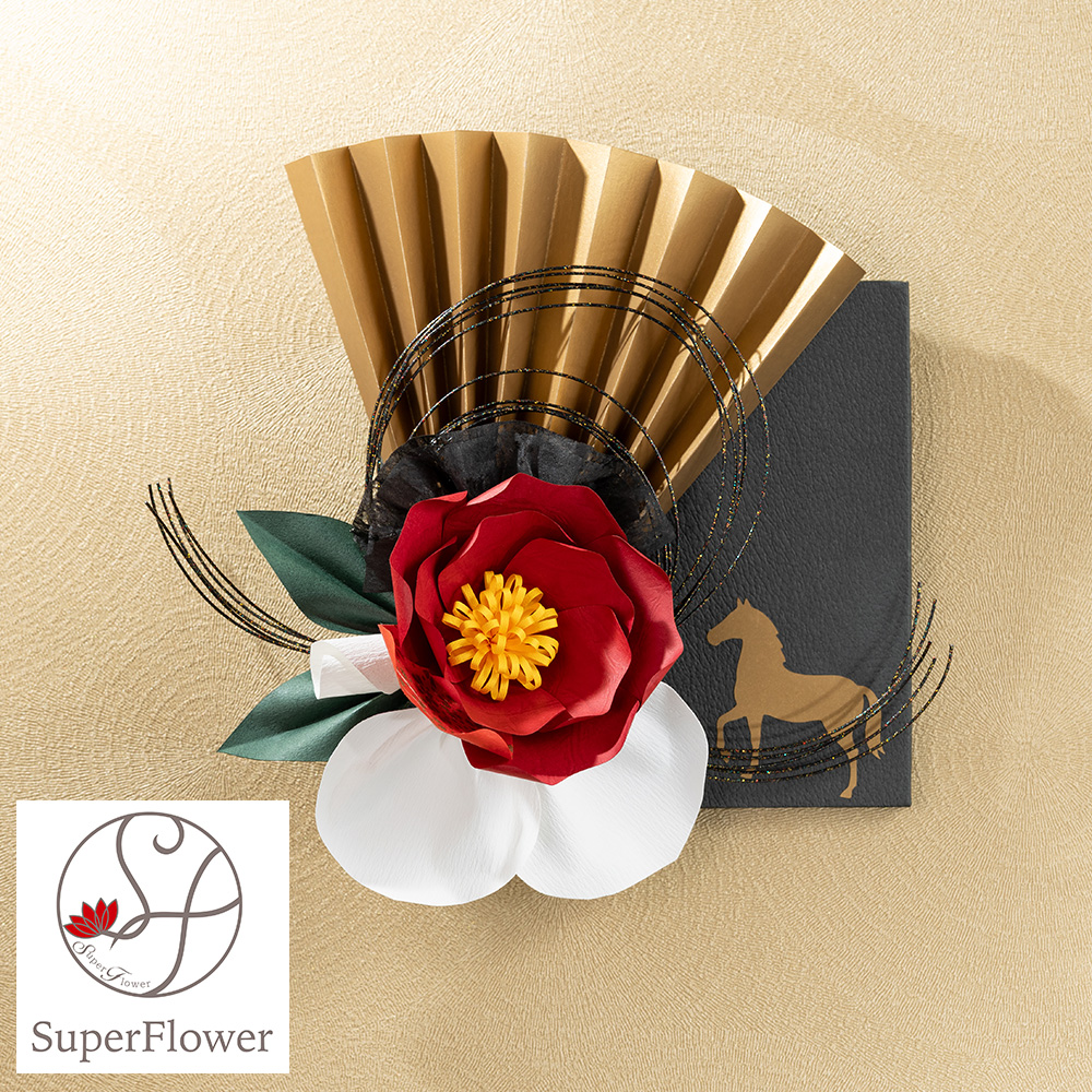 ご紹介するのは、紅椿をモチーフにした壁飾り。2026年の干支、午(馬)の切り絵を飾ったボードに、蘭の花弁や金扇・水引を組み合わせた上品な仕立てです。お部屋のちょっとしたスペースにも飾りやすいサイズ感でご用意しました。