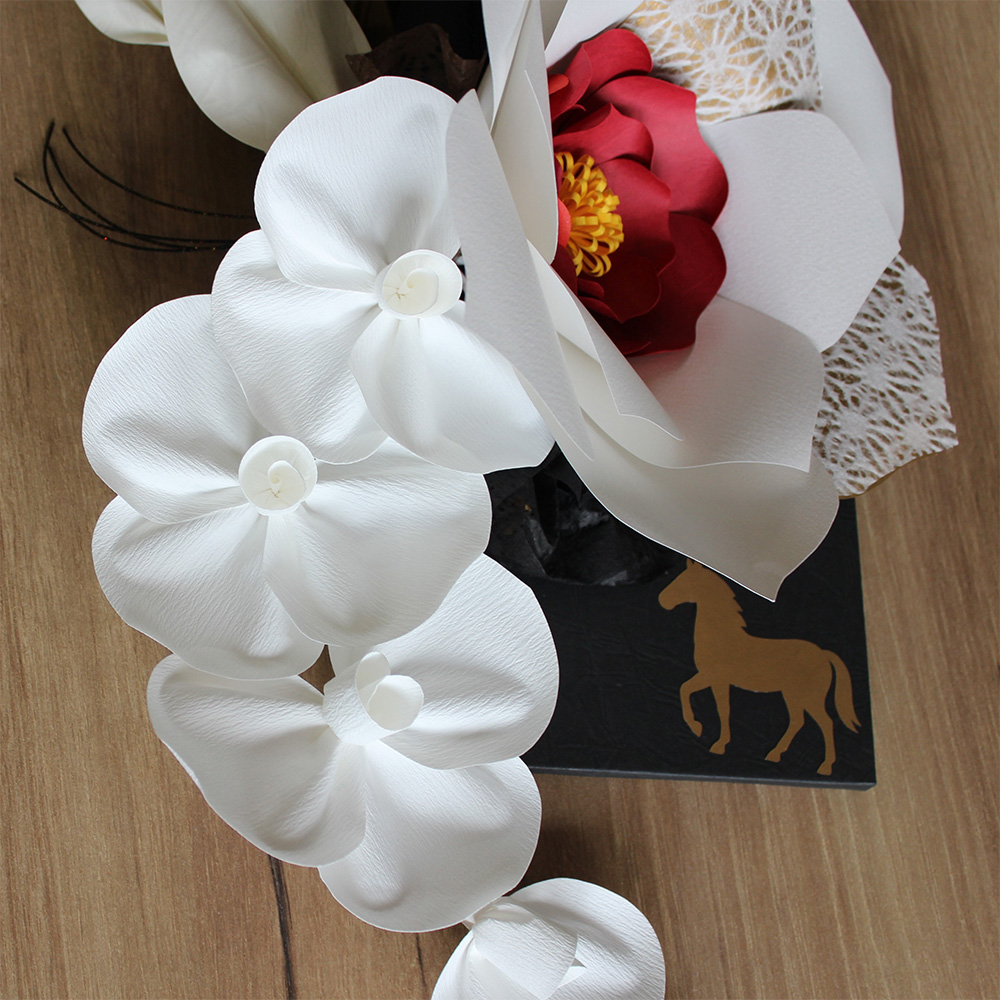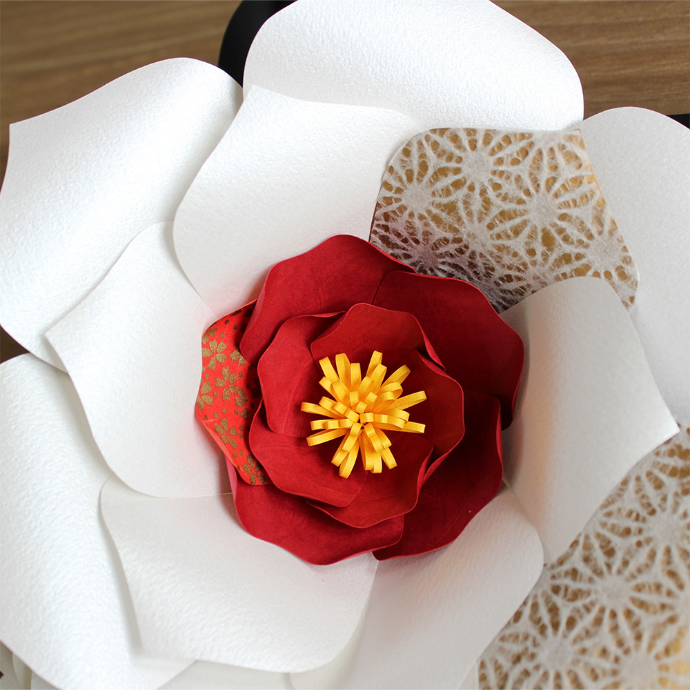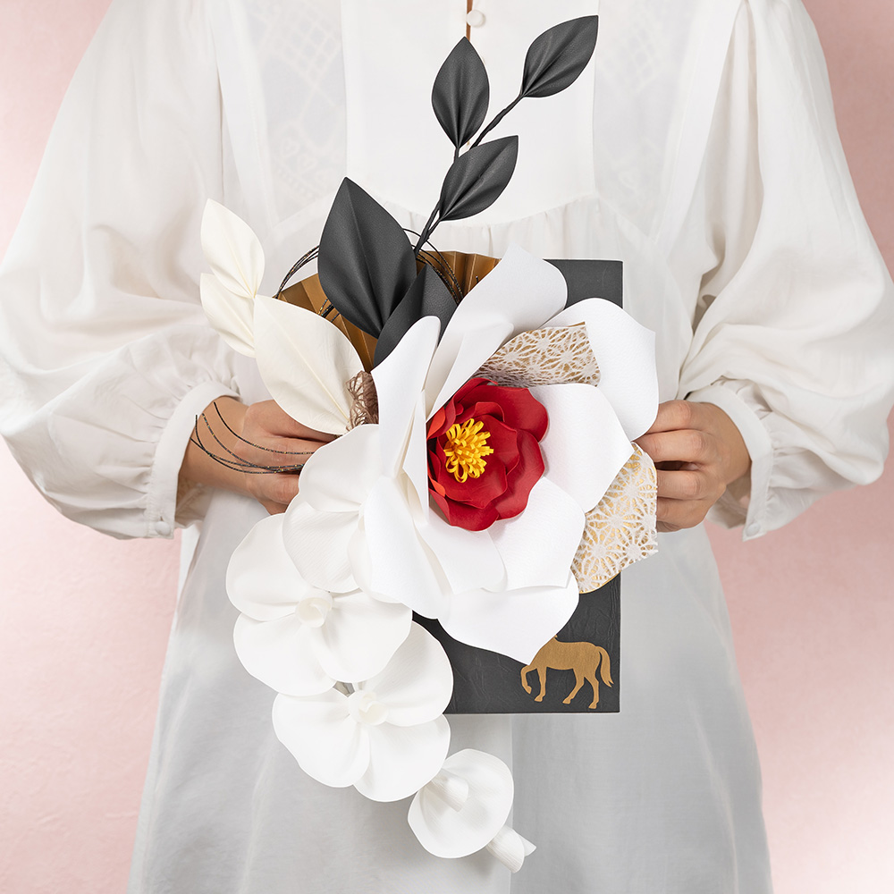 SuperFlowerは、2016年熊本地震からの復興の願いとともに誕生したアートフラワーブランド。女性の就労支援と社会的な活躍の場を増やしていく取り組みをお花作りを通して行っています。その活動に共感し、今回イイハナとの初コラボが実現しました。本の表紙・ハイブランドの紙袋などで使用する高級紙や、和紙を使って、熟練の花職人が一つひとつ丁寧に手作りしたお花は、高級感と温かみが感じられます。