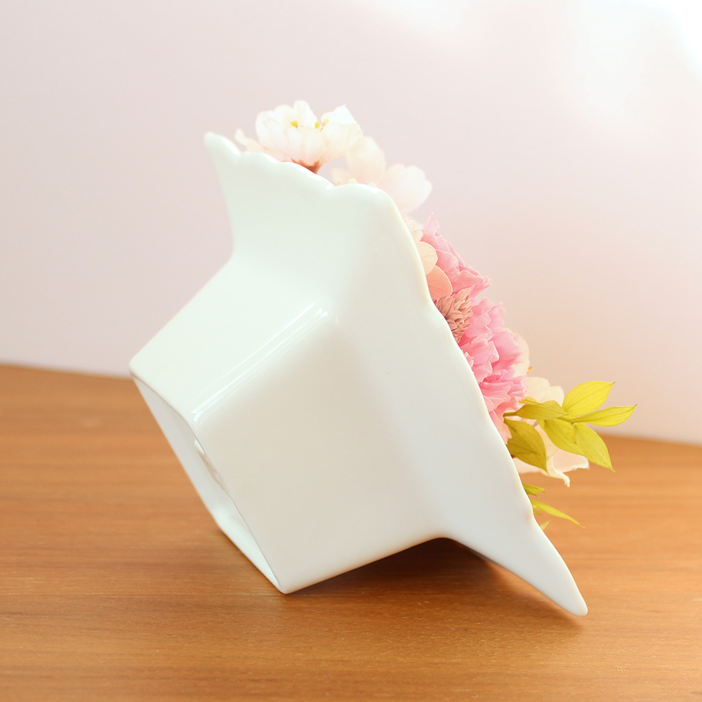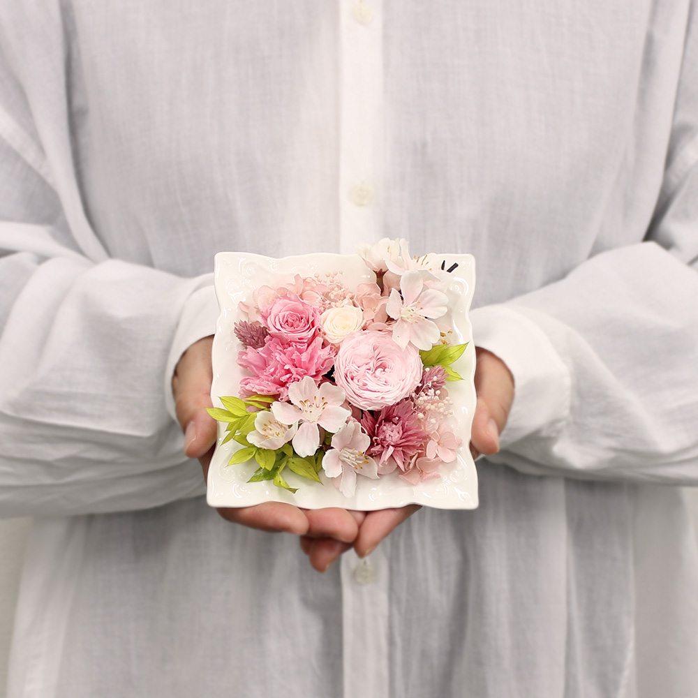 可憐なアートフラワーの桜を使った、ふんわり優しい桜色のフレームアレンジです。純白の陶器フレームは、レースのような曲線のあるデザインが特長的。コーナー部分にはさりげなく凹凸模様が施されています。