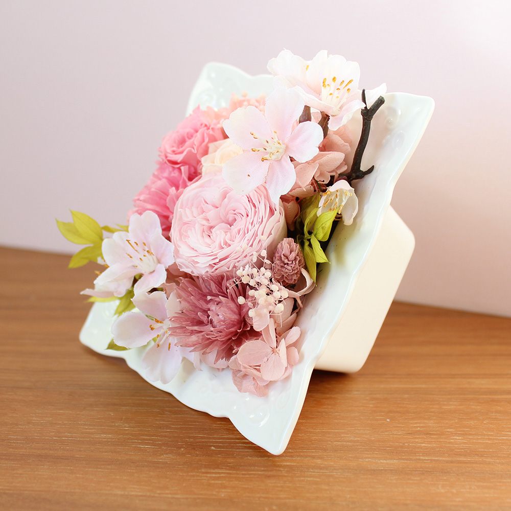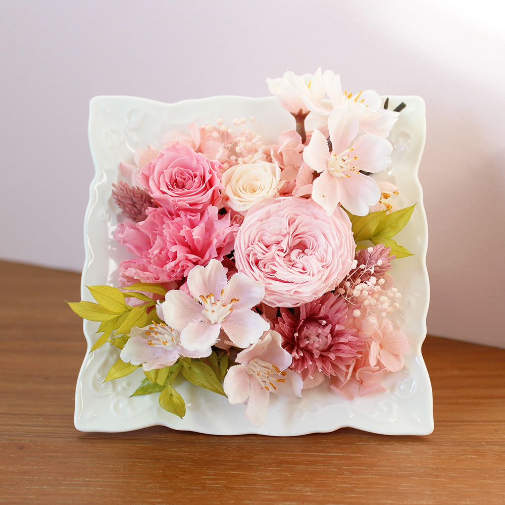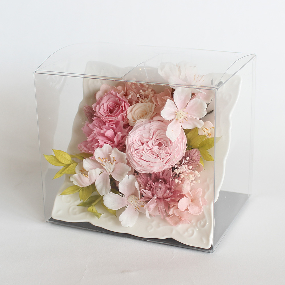 | 花材 | プリザーブドフラワー:クラシックローズ(丸咲きバラ)、ミニバラ、カーネーション、カスミソウ、アジサイ、グリーン ドライフラワー:ミニシルバーデージー、ファラリス アートフラワー:桜 |