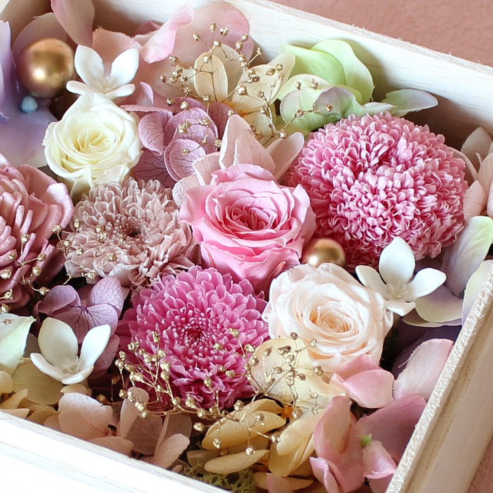 ※こちらの商品は、プリザーブドフラワーの他、ドライフラワー、アーティフィシャルフラワー等を使用し、異なる素材を組み合わせたデザインです。