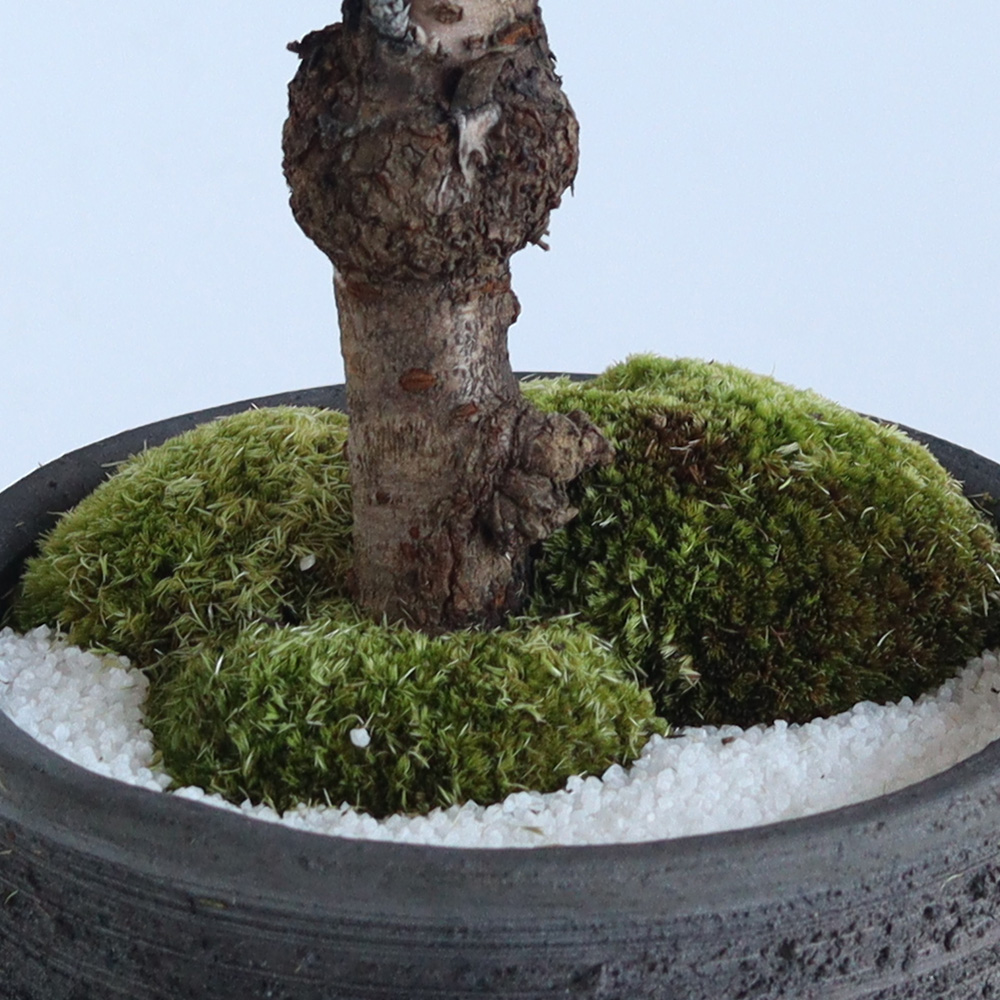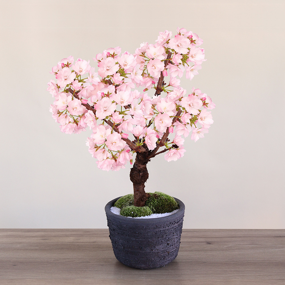 渋みのある茶色の素焼鉢に、可憐な淡いピンクの桜を仕立てた、和の趣あふれる桜の盆栽です。日本庭園に咲く桜をイメージし、苔と真っ白な化粧石をあしらい、奥ゆかしい和モダンな空間を演出します。苔が乾燥しないように、水やりをしながら管理していただくと、暖かくなるにつれてだんだんとつぼみがふくらみ、見ごろになる桜の姿を楽しみながら、春を迎えていただけます。
