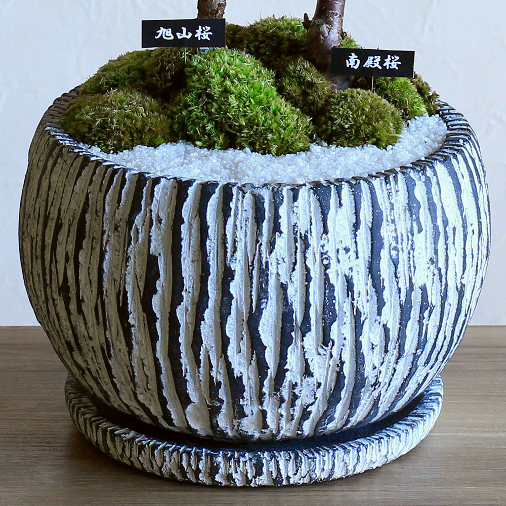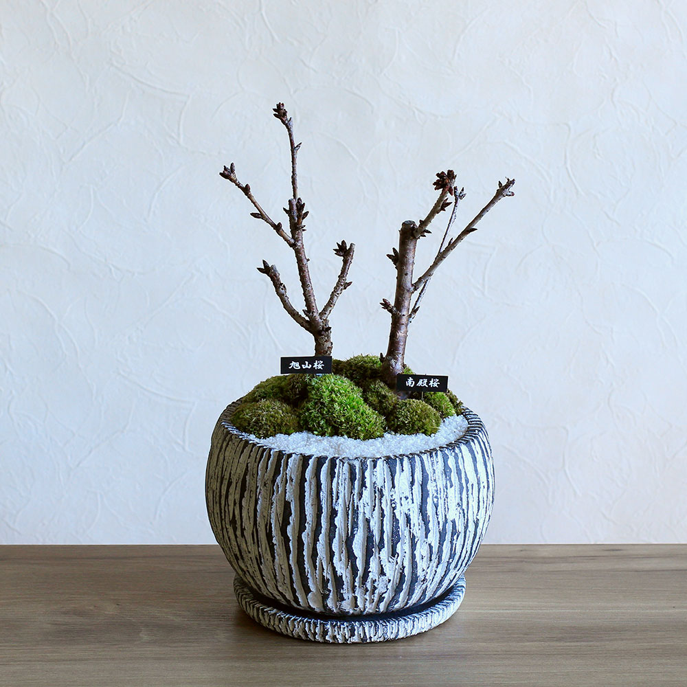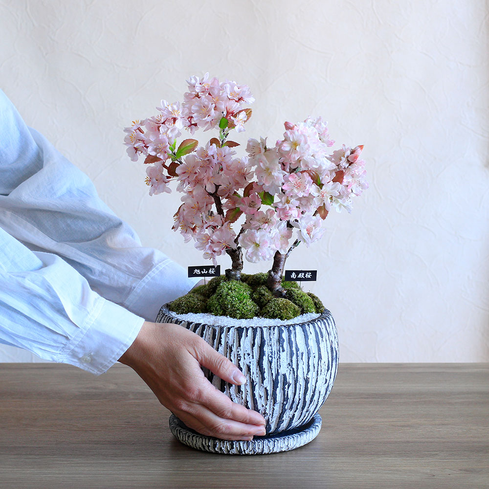 桜の盆栽をもっと贅沢に楽しんでいただきたく、旭山桜と南殿桜の2種類の桜を使った盆栽風の寄せ植えです。鉢の中という限られた空間に表現された、儚いからこそ美しい桜の魅力、四季の移ろいを感じていただけます。贈り物としてだけではなく、ゆっくりお花見を楽しむご自宅用としてもオススメです。