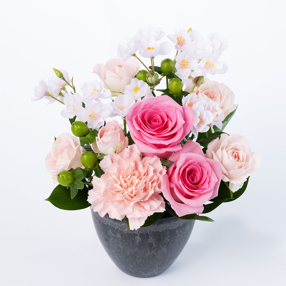 | 花材 | 桜、バラ×2輪、カーネーション、スプレーバラ、ヒペリカム、丸葉ルスカス |