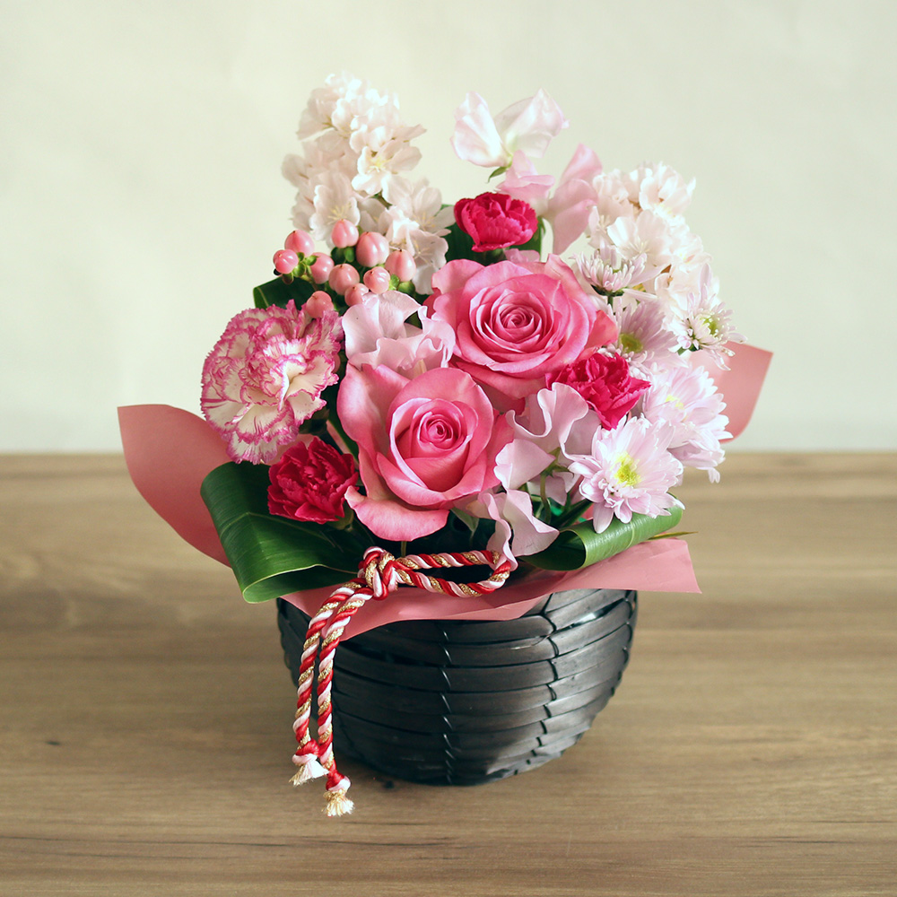 | 花材 | 桜、バラ×2輪、カーネーション、ヒペリカム、スプレーカーネーション、スプレーマム、ドラセナ ※長くお楽しみいただくため、桜はつぼみの状態でお届けします。 |